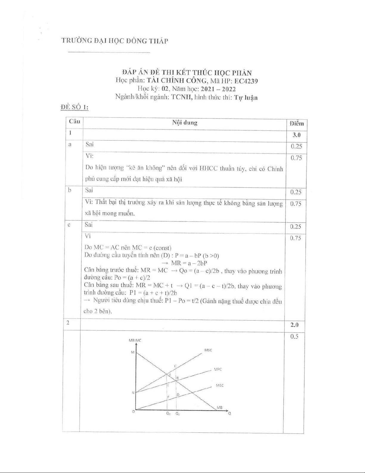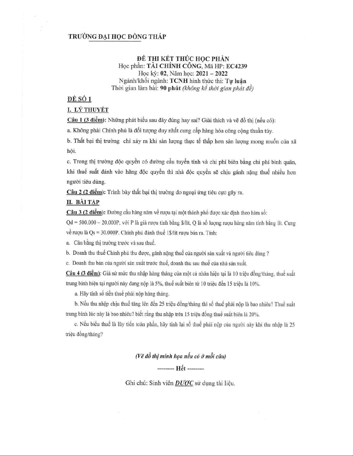Đề thi kết thúc học phần học kì 2 môn Tài chính công năm 2021-2022 có đáp án - Trường ĐH Đồng Tháp