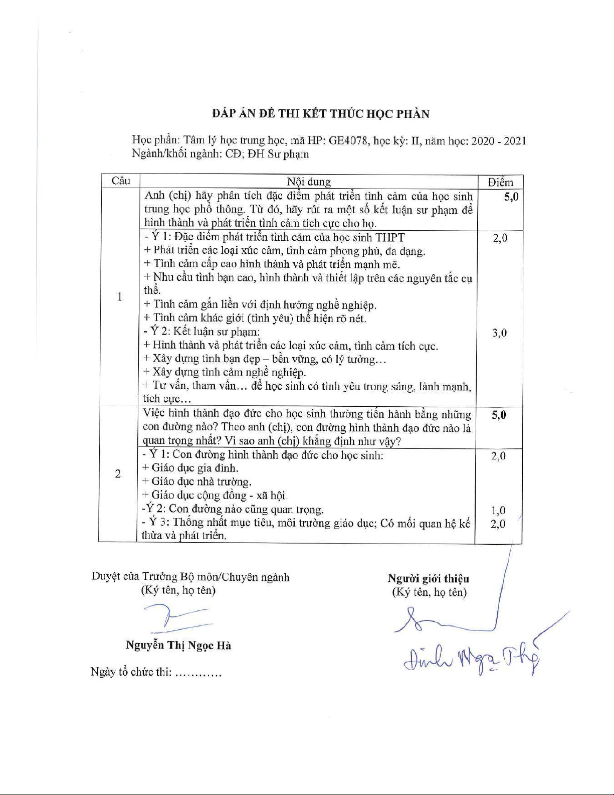 Đề thi kết thúc học phần học kì 2 môn Tâm lý học trung học năm 2020-2021 có đáp án - Trường ĐH Đồng Tháp