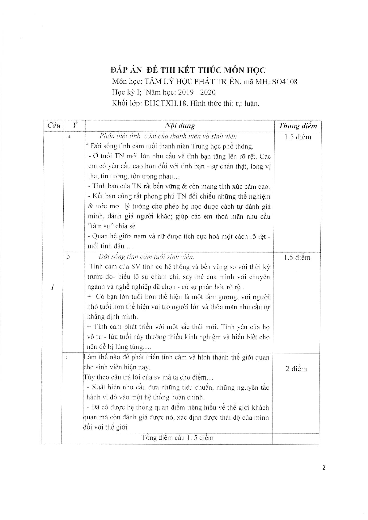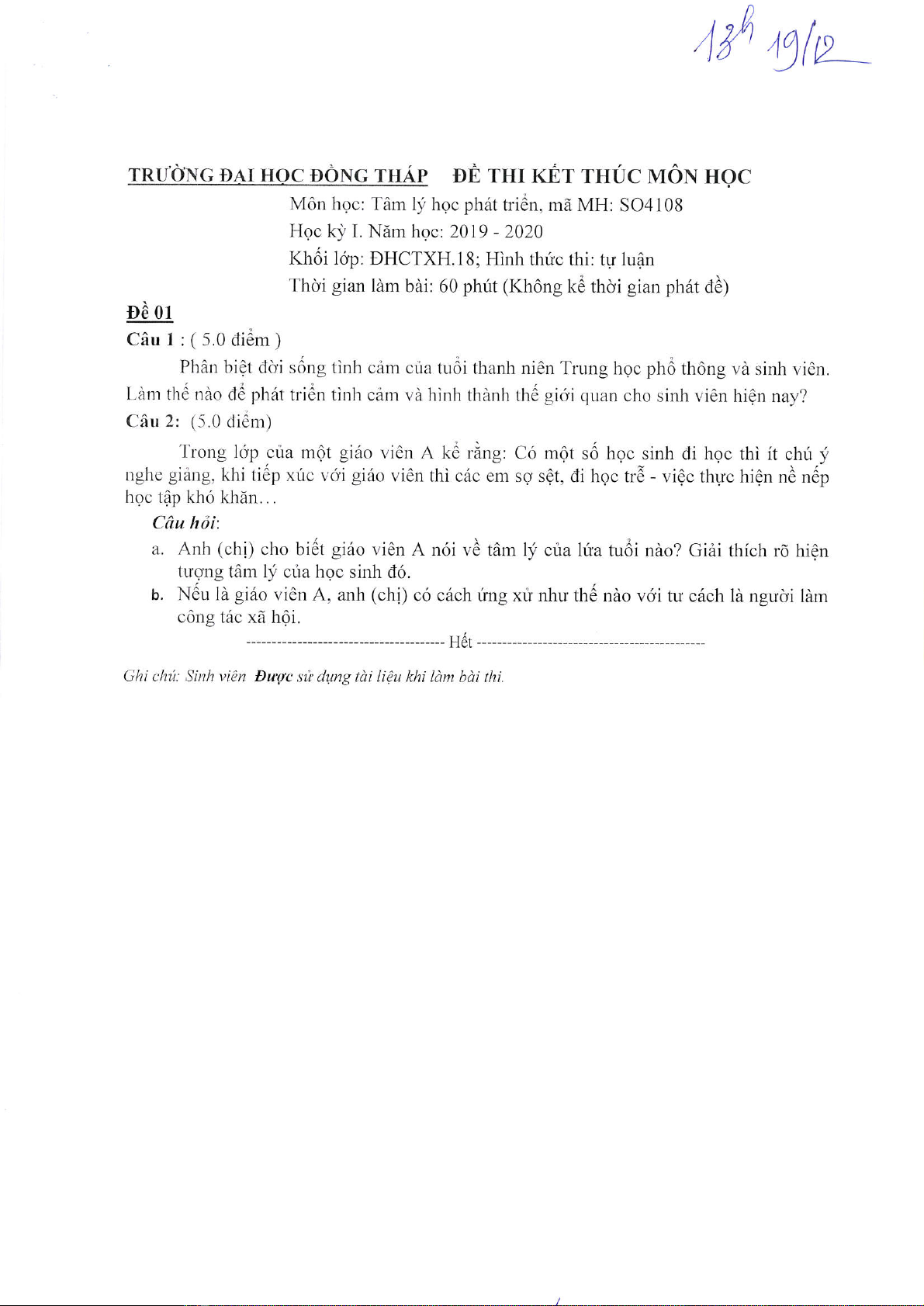 Đề thi kết thúc học phần học kì 1 môn Tâm lý học phát triển năm 2019-2020 có đáp án - Trường ĐH Đồng Tháp