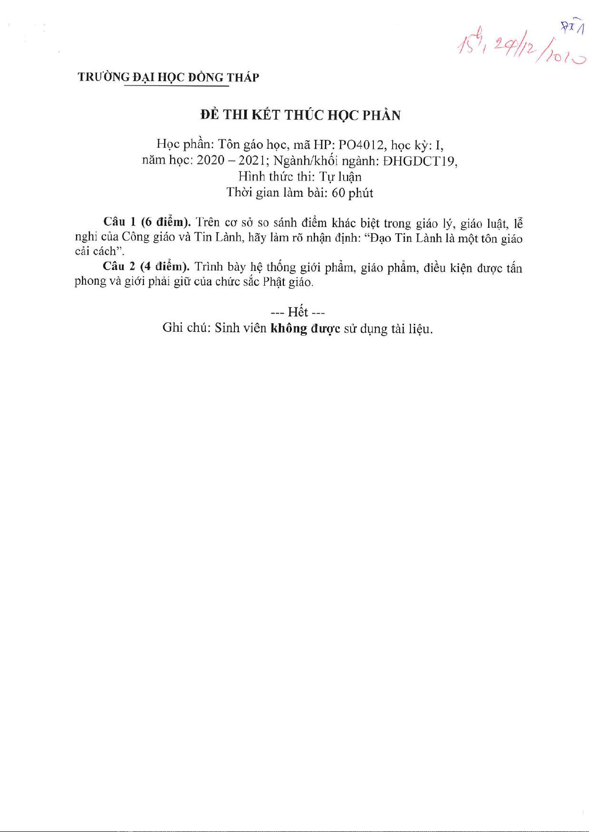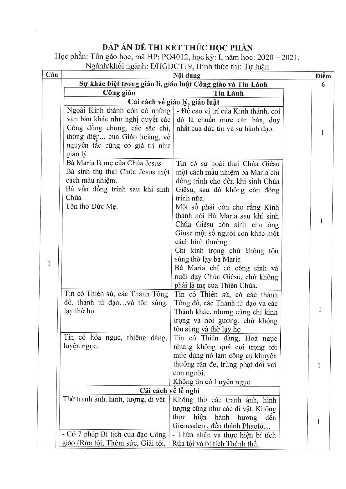 Đề thi kết thúc học phần học kì 1 môn Tôn giáo học năm 2020-2021 có đáp án - Trường ĐH Đồng Tháp