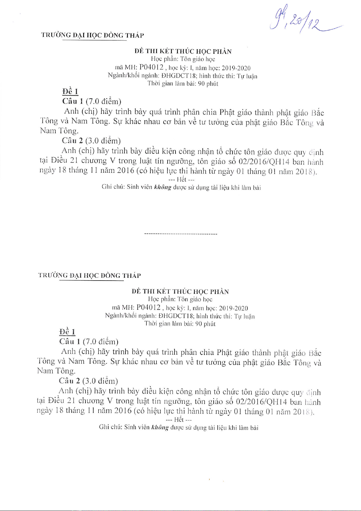 Đề thi kết thúc học phần học kì 1 môn Tôn giáo học năm 2019-2020 có đáp án - Trường ĐH Đồng Tháp