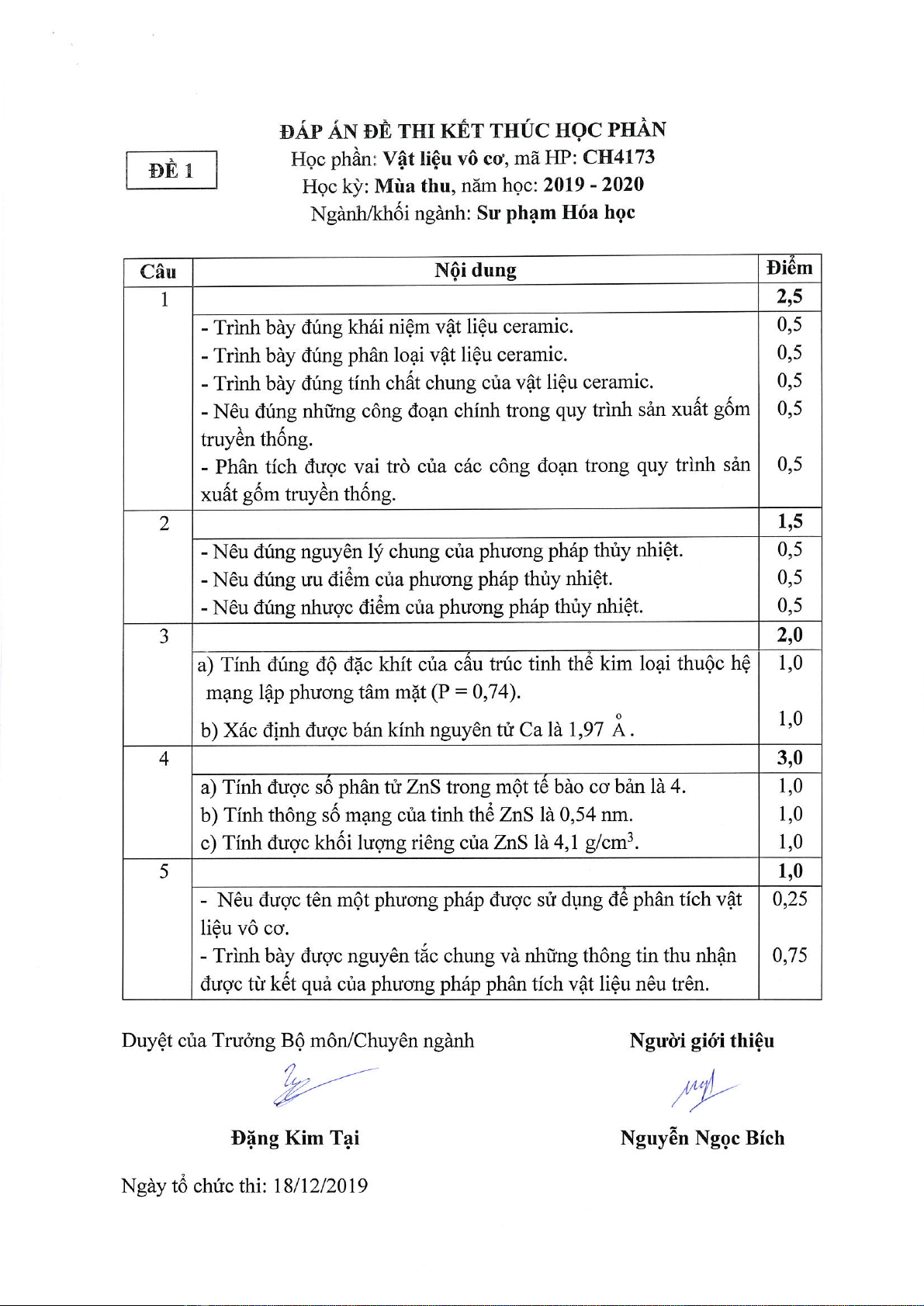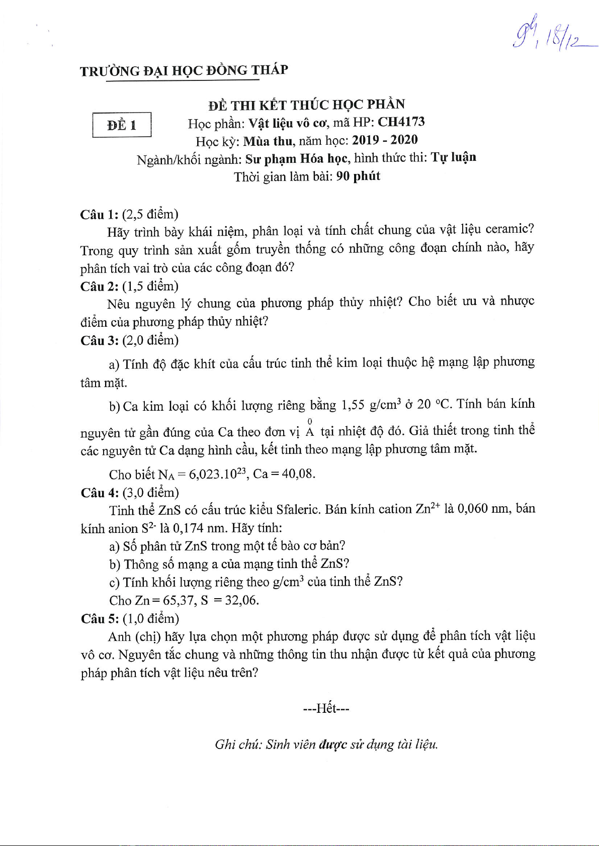 Đề thi kết thúc học phần học kì 1 môn Vật liệu vô cơ năm 2019-2020 có đáp án - Trường ĐH Đồng Tháp