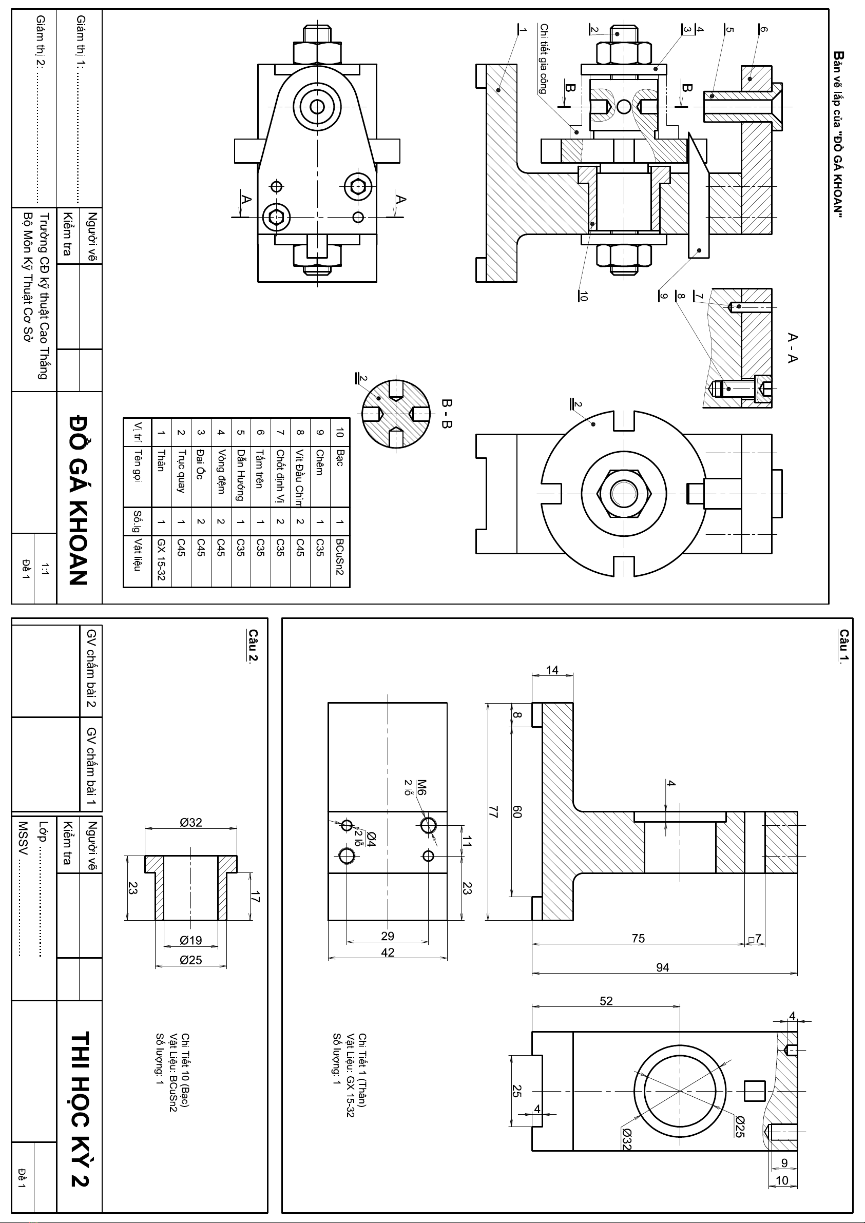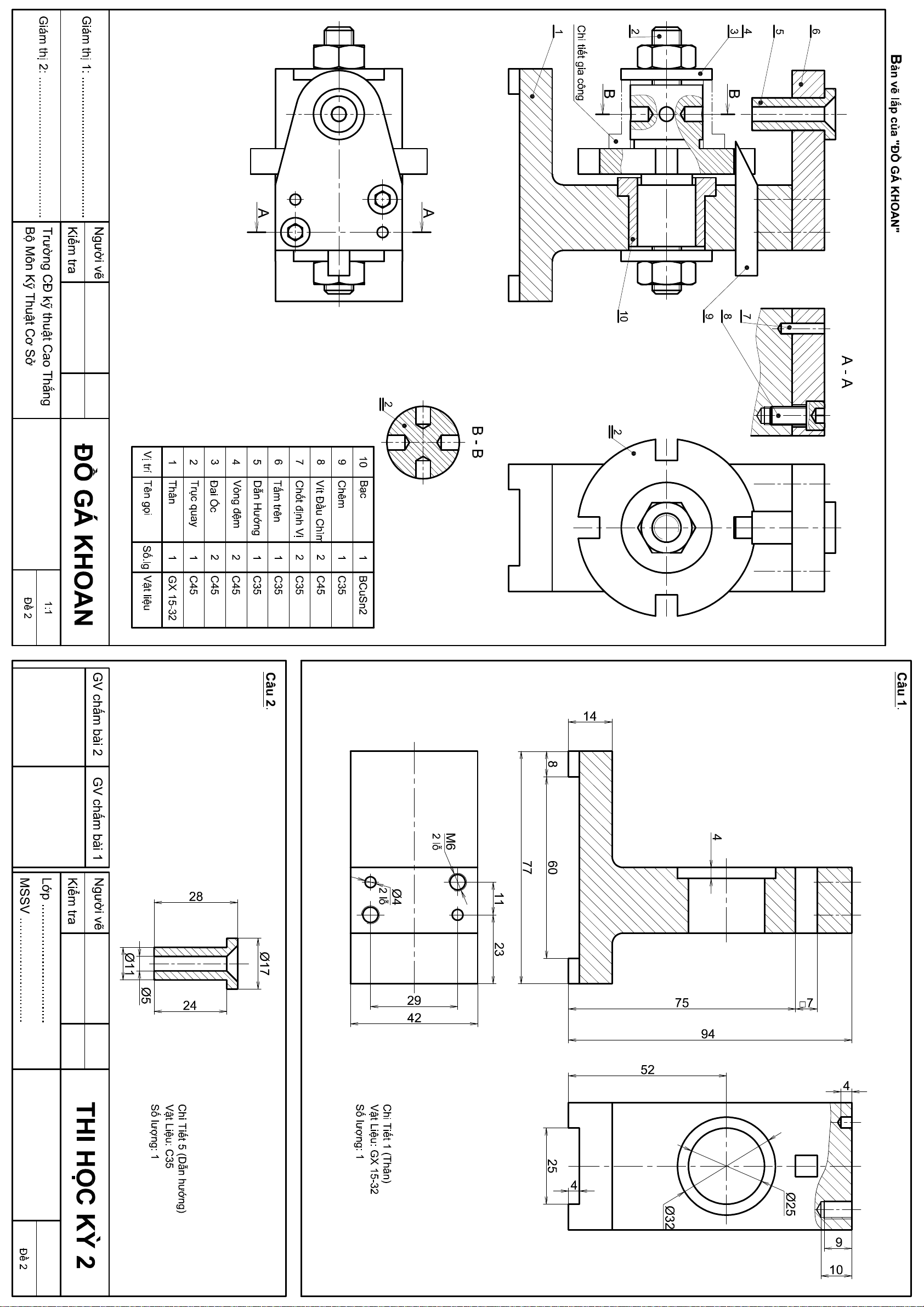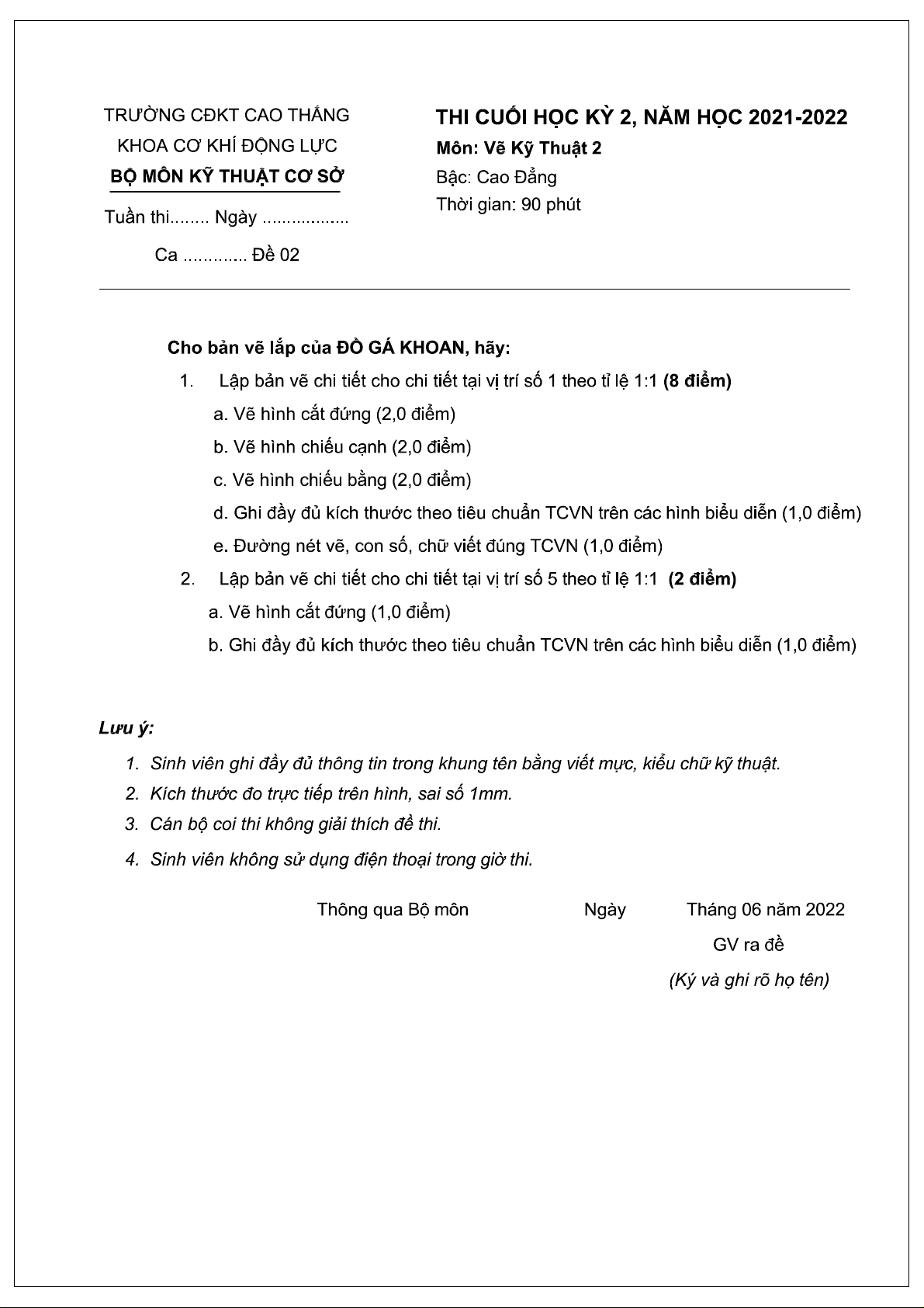 Đề thi kết thúc học phần học kì 2 môn Vẽ kỹ thuật 2 năm 2021-2022 có đáp án - Trường CĐ Kỹ thuật Cao Thắng (Ngành Cơ khí)