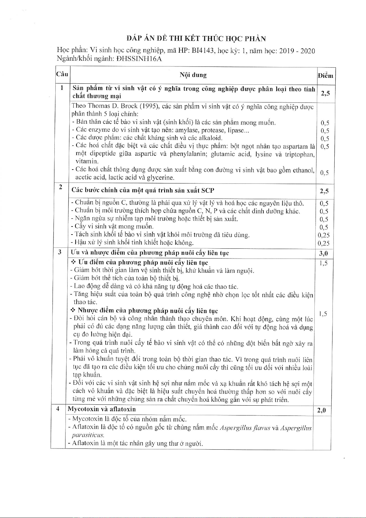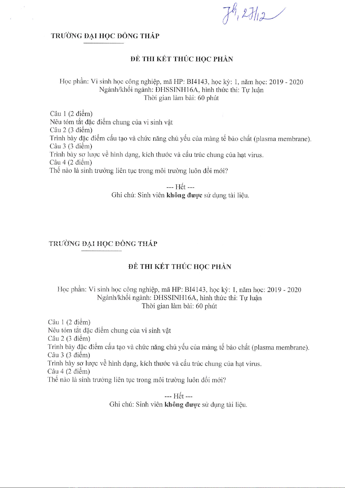 Đề thi kết thúc học phần học kì 1 môn Vi sinh học công nghiệp năm 2019-2020 có đáp án - Trường ĐH Đồng Tháp