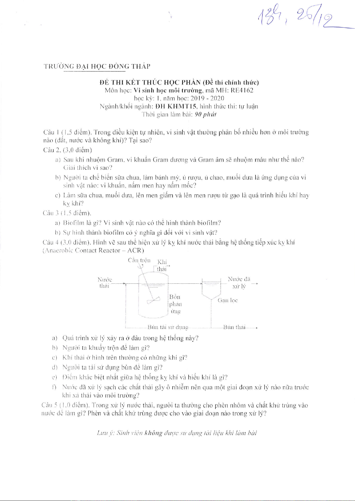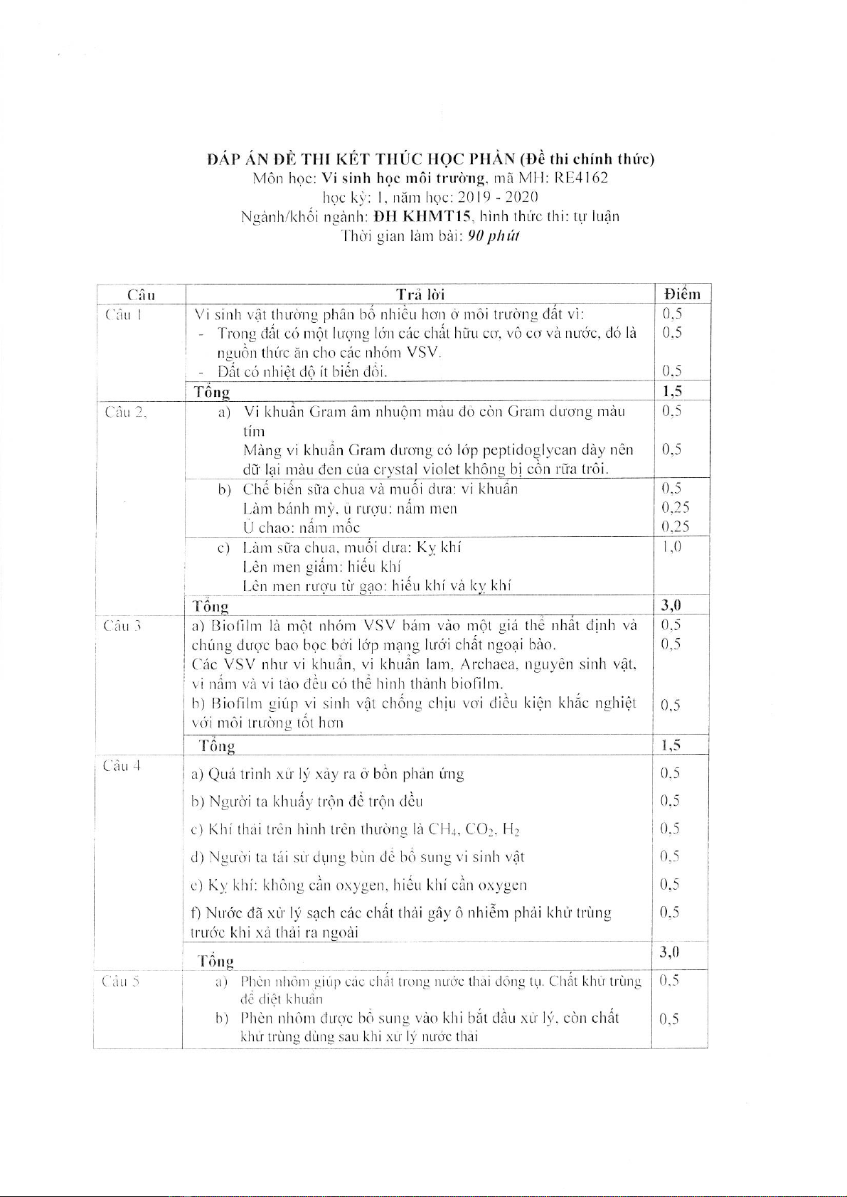 Đề thi kết thúc học phần học kì 1 môn Vi sinh học môi trường năm 2019-2020 có đáp án - Trường ĐH Đồng Tháp