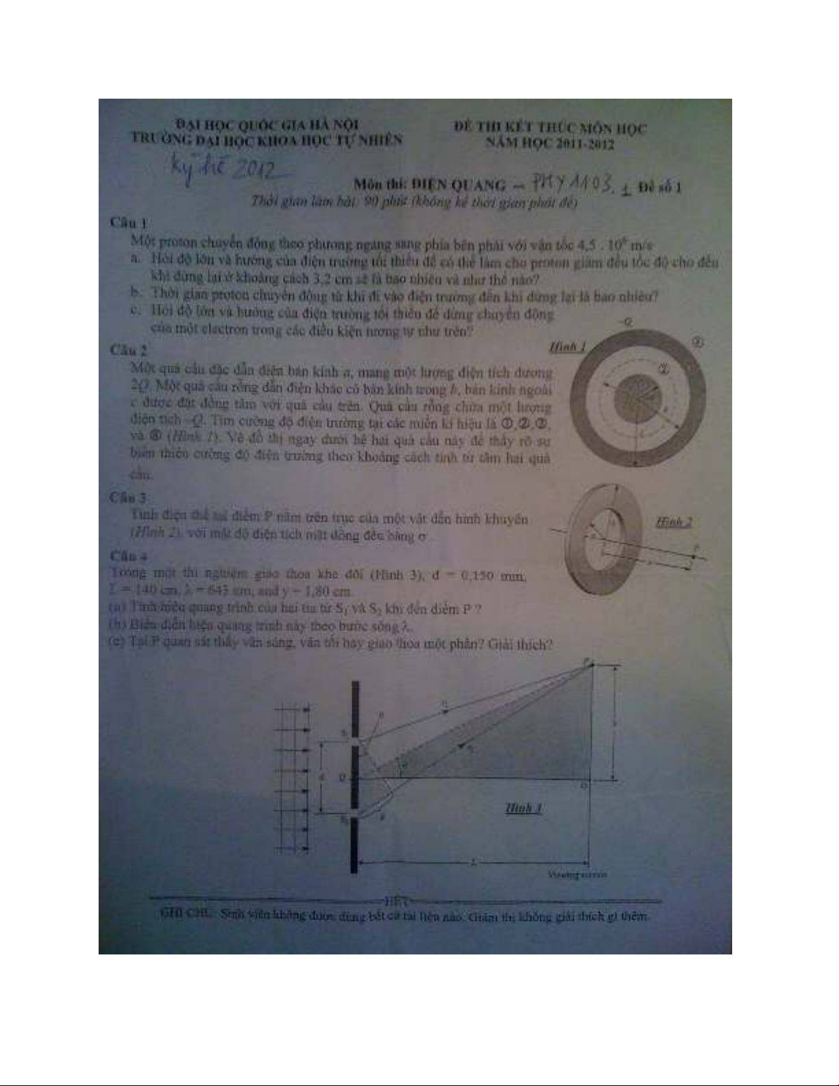 Đề thi kết thúc môn học năm 2011-2012 môn Điện quang (Đề số 1) - ĐH Khoa học Tự nhiên