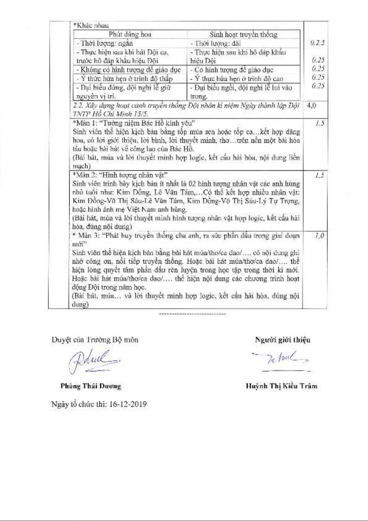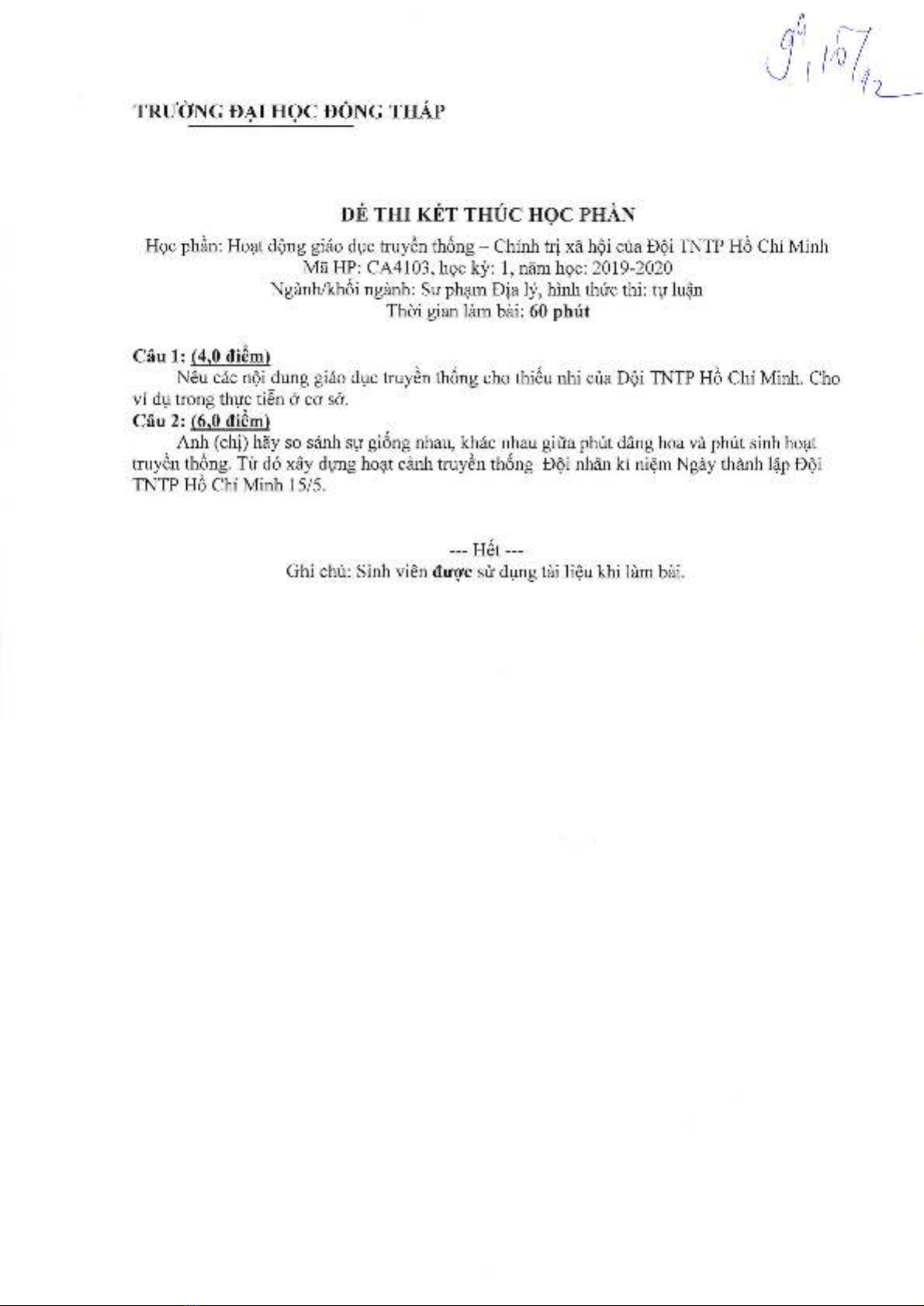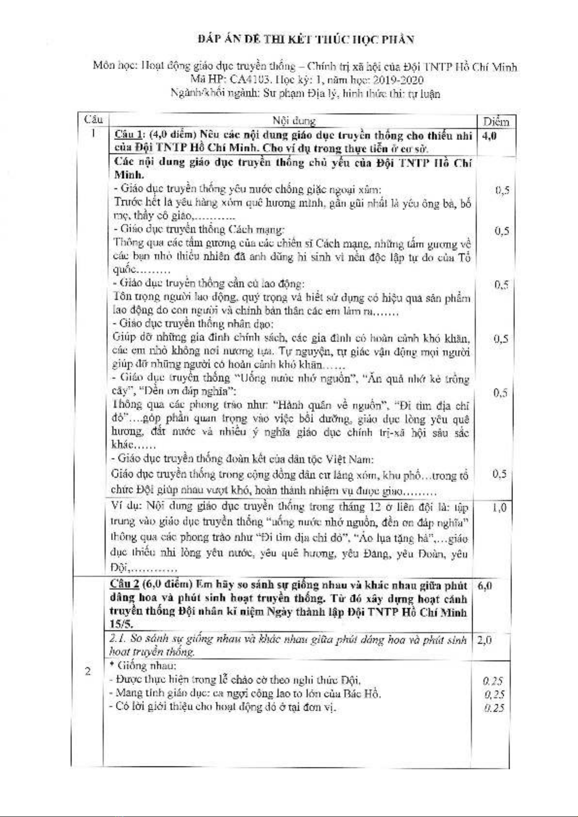 Đề thi kết thúc môn học Hoạt động giáo dục truyền thống năm 2019-2020 có đáp án - Trường ĐH Đồng Tháp