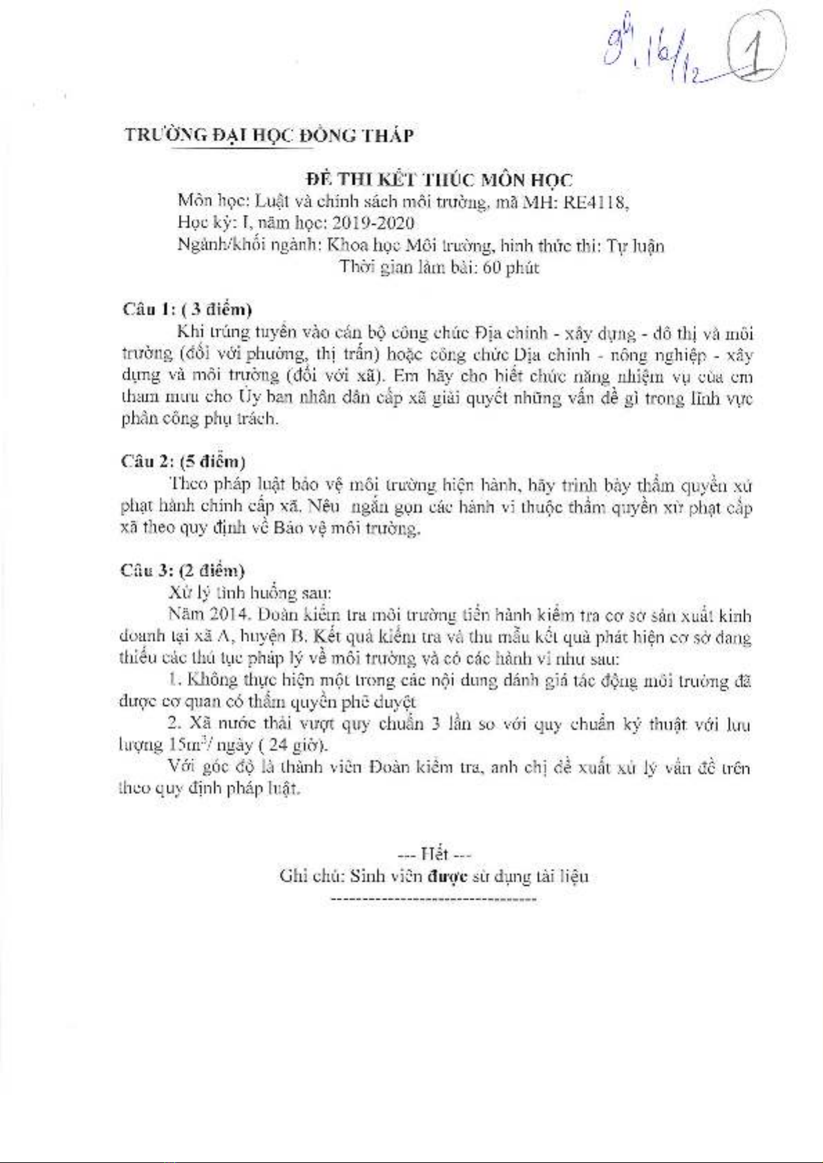 Đề thi kết thúc môn học Luật và chính sách môi trường năm 2019-2020 có đáp án - Trường ĐH Đồng Tháp