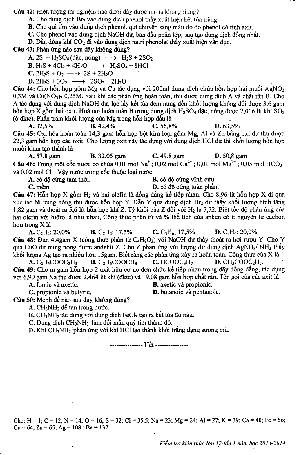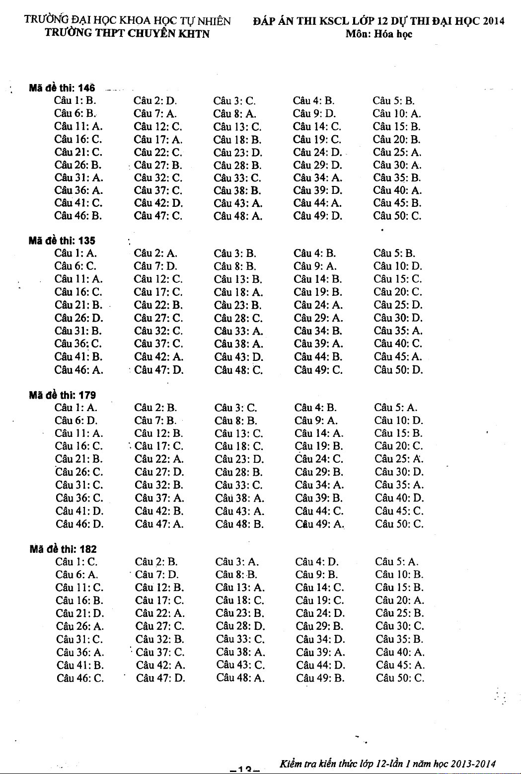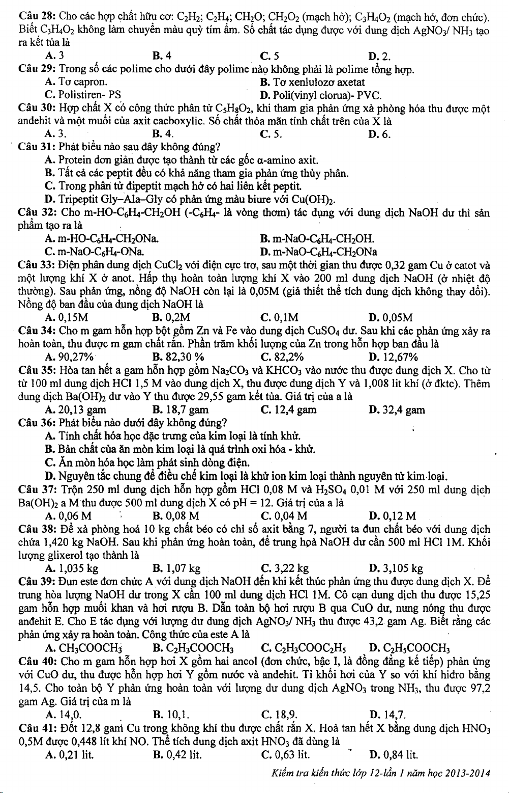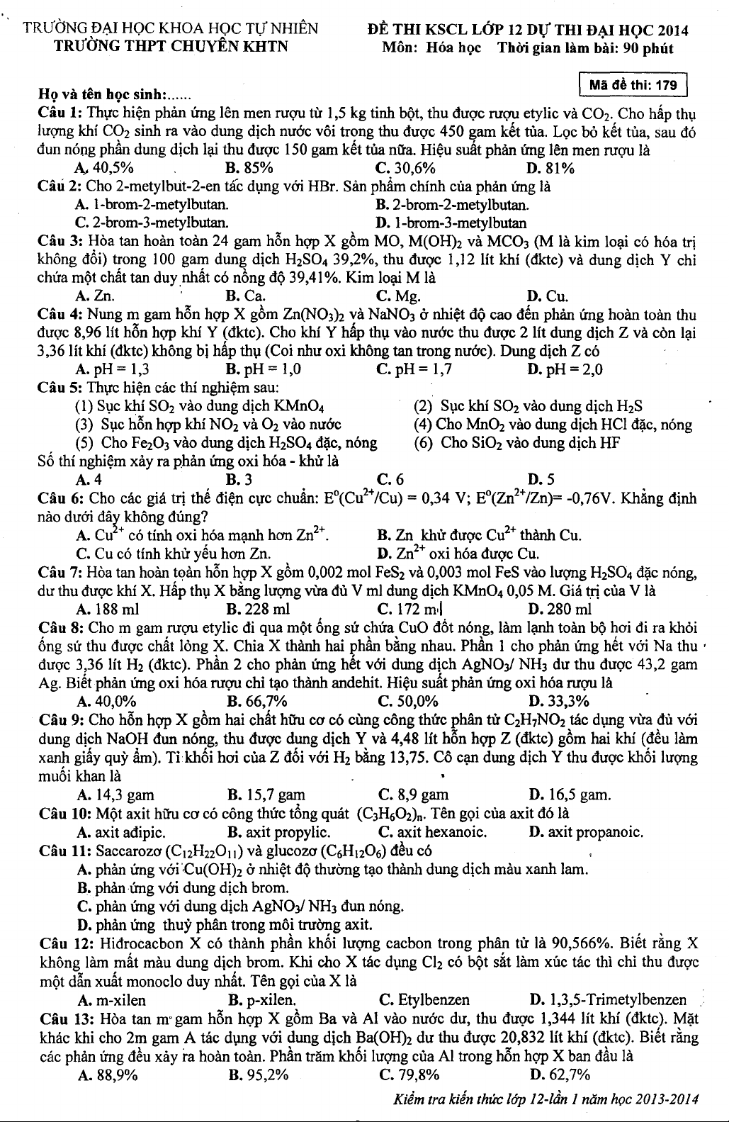 Đề thi khảo sát chất lượng Hóa học lớp 12 dự thi Đại học 2014 - Trường THPT Chuyên KHTN