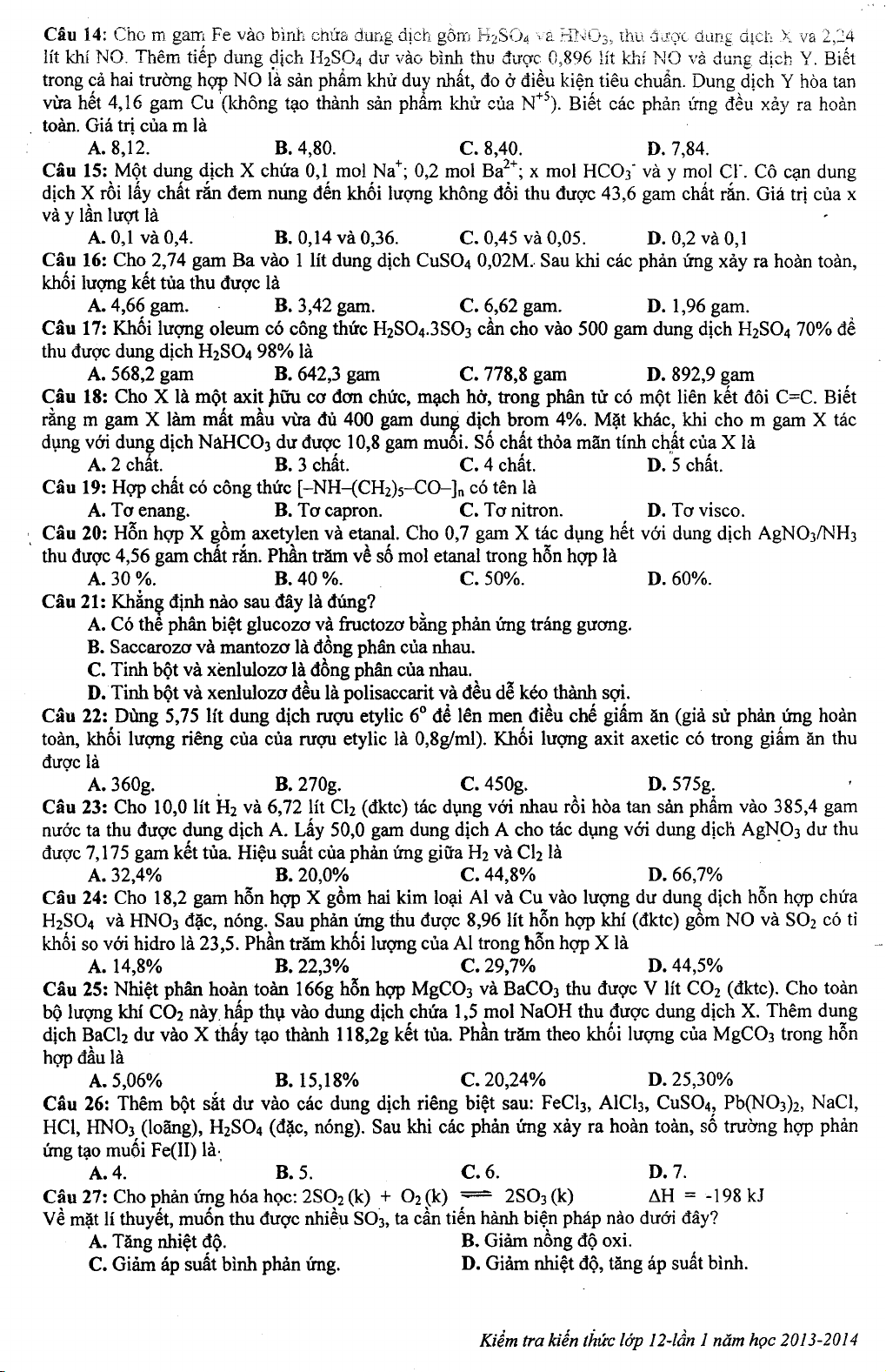 Đề thi khảo sát chất lượng Hóa học lớp 12 dự thi Đại học 2014 nhằm kiểm tra chất lượng học sinh chuẩn bị cho kì thi Đại học 2014. Chúc các em ôn luyện tốt.