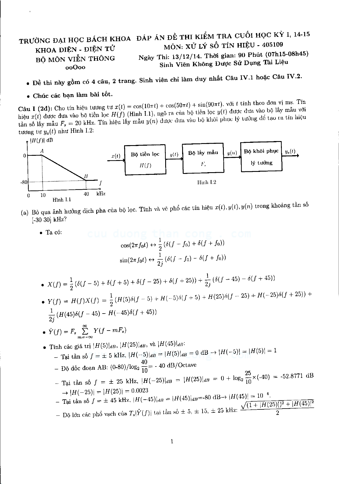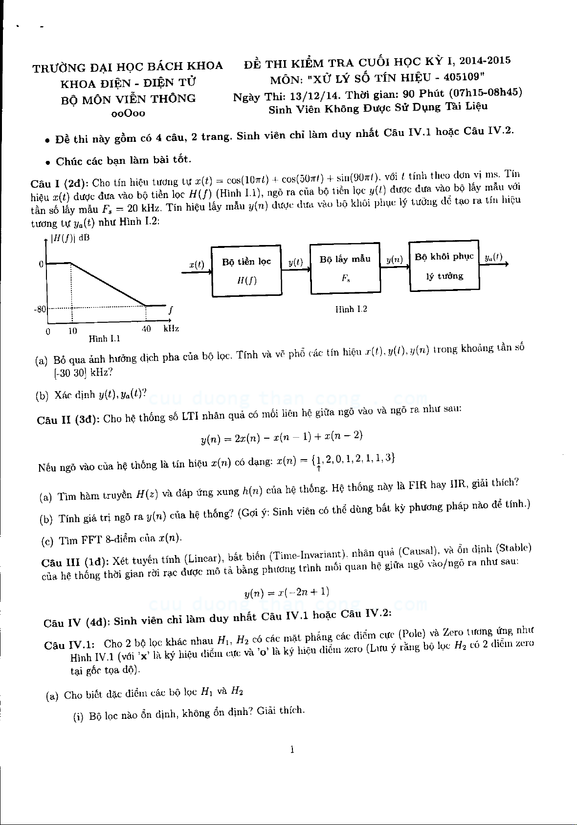Đề thi kiểm tra cuối học kỳ I năm học 2014 - 2015 môn Xử lý số tín hiệu