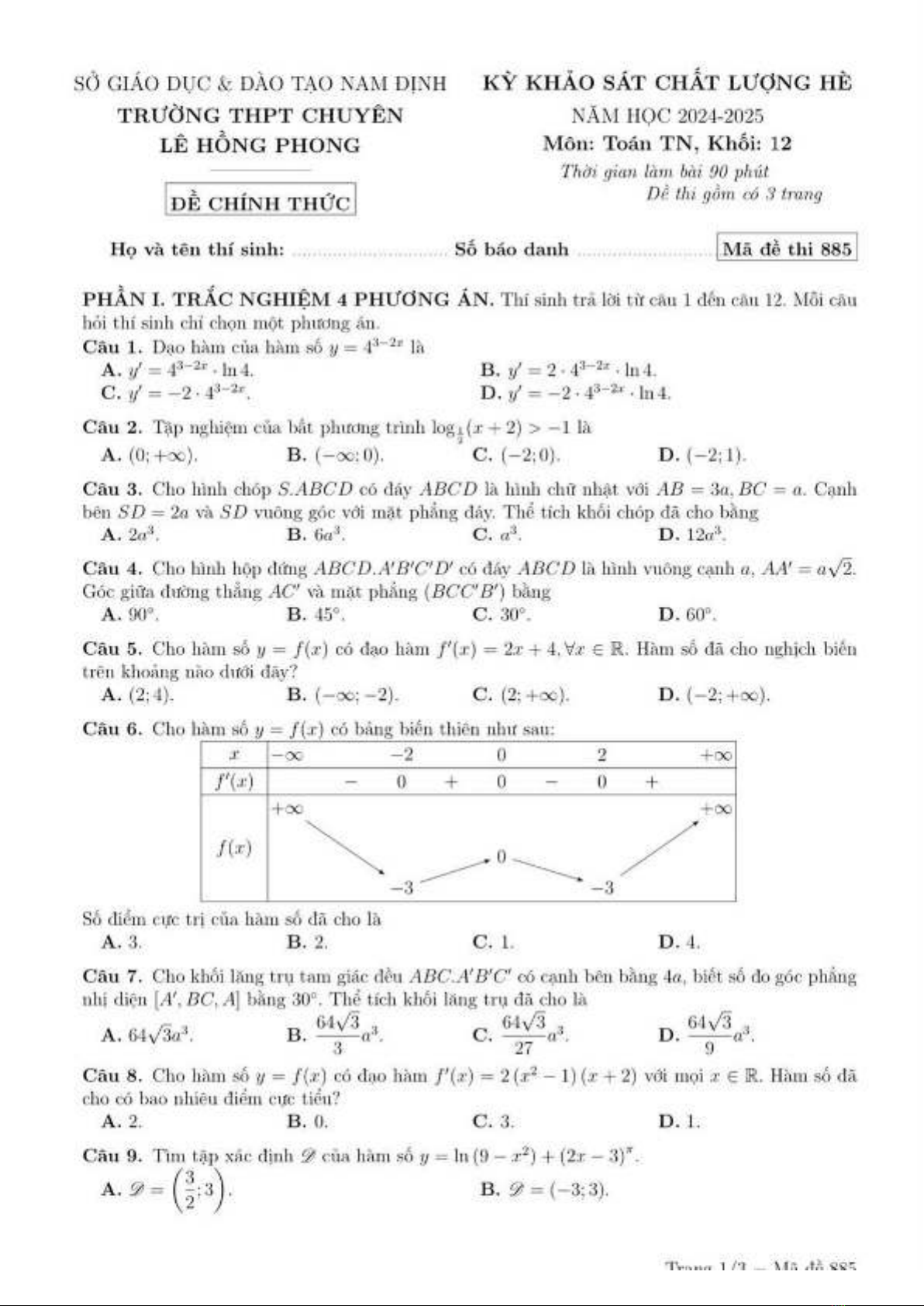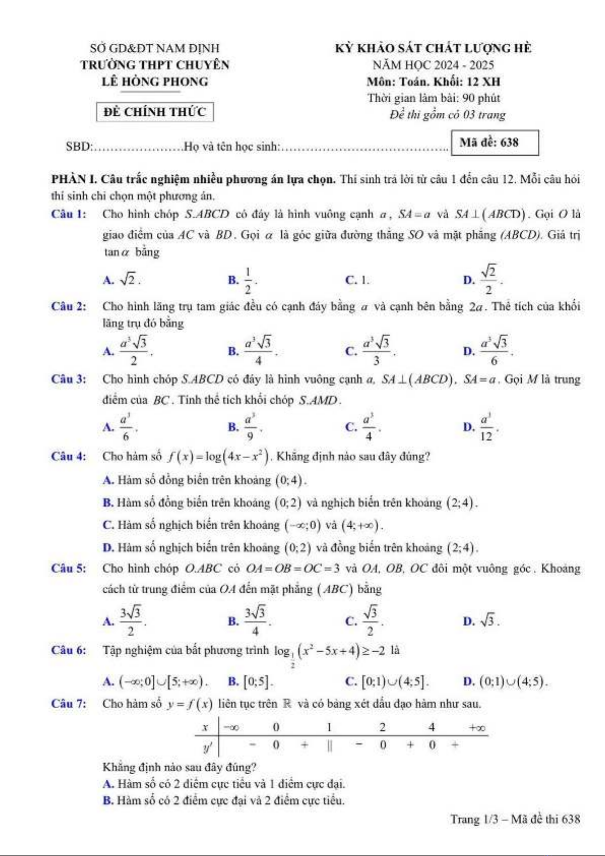 Đề thi KSCL môn Toán lớp 12 năm 2024-2025 của Trường THPT Chuyên Lê Hồng Phong, Nam Định bao gồm các phần khác nhau mỗi phần có các câu hỏi riêng biệt. Học sinh lớp 12 phải nắm vững kiến thức Toán để giải quyết các vấn đề trong đề thi. Tài liệu này cung cấp một số dạng câu hỏi khác nhau, giúp các em ôn tập và chuẩn bị cho kì thi chính thức. Ngoài ra, đề thi cũng giúp các em phát triển kỹ năng giải quyết vấn đề và suy nghĩ logic.