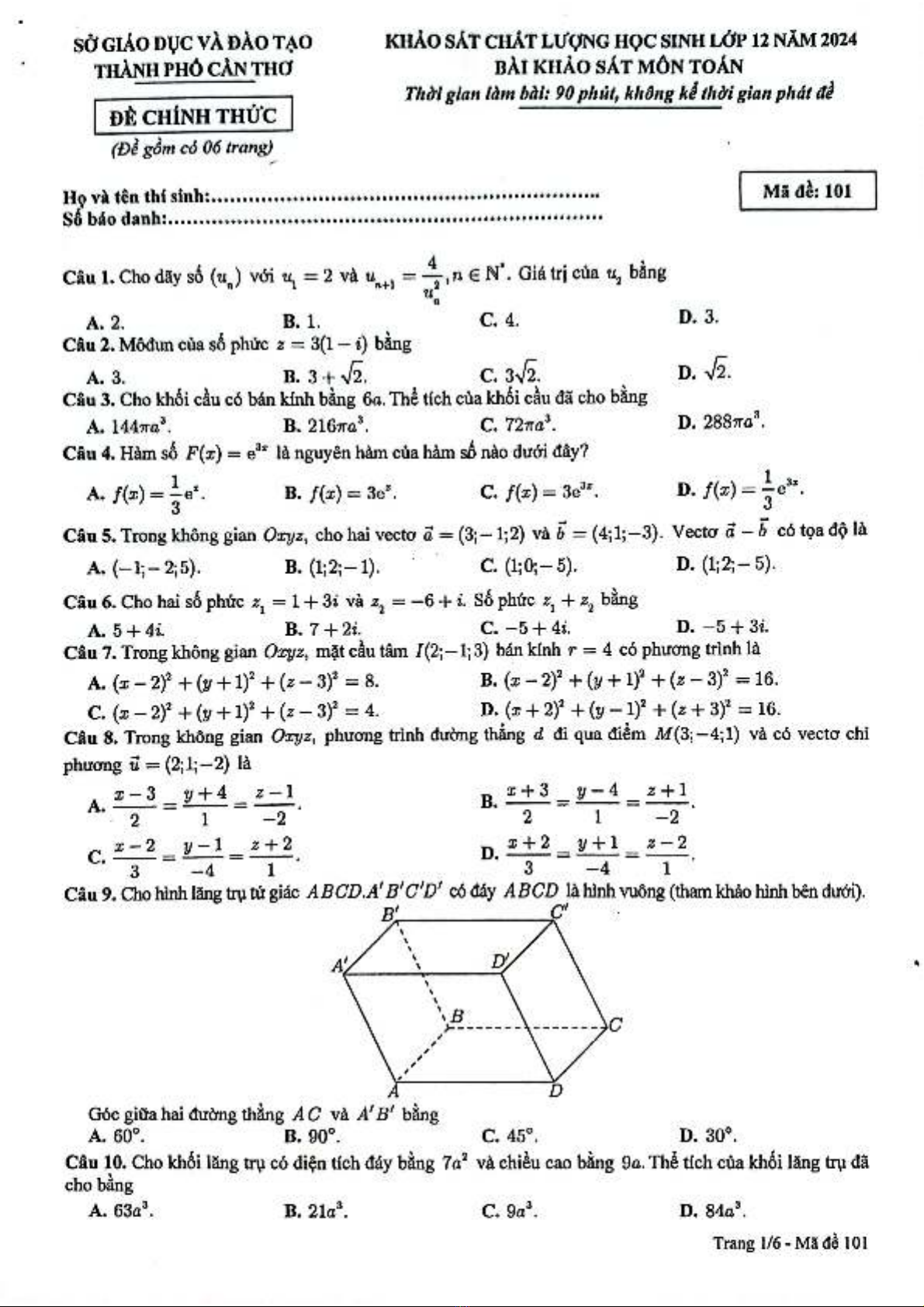 Đề thi KSCL môn Toán lớp 12 năm 2024-2025 có đáp án - Sở GD&ĐT Cần Thơ là tài liệu giúp cho quý thầy cô và học sinh củng cố kiến thức trước khi bước vào kì thi tốt nghiệp THPT sắp tới. Đề thi này mô tả các phương pháp, tính toán, đáp án cho các câu hỏi về Toán.