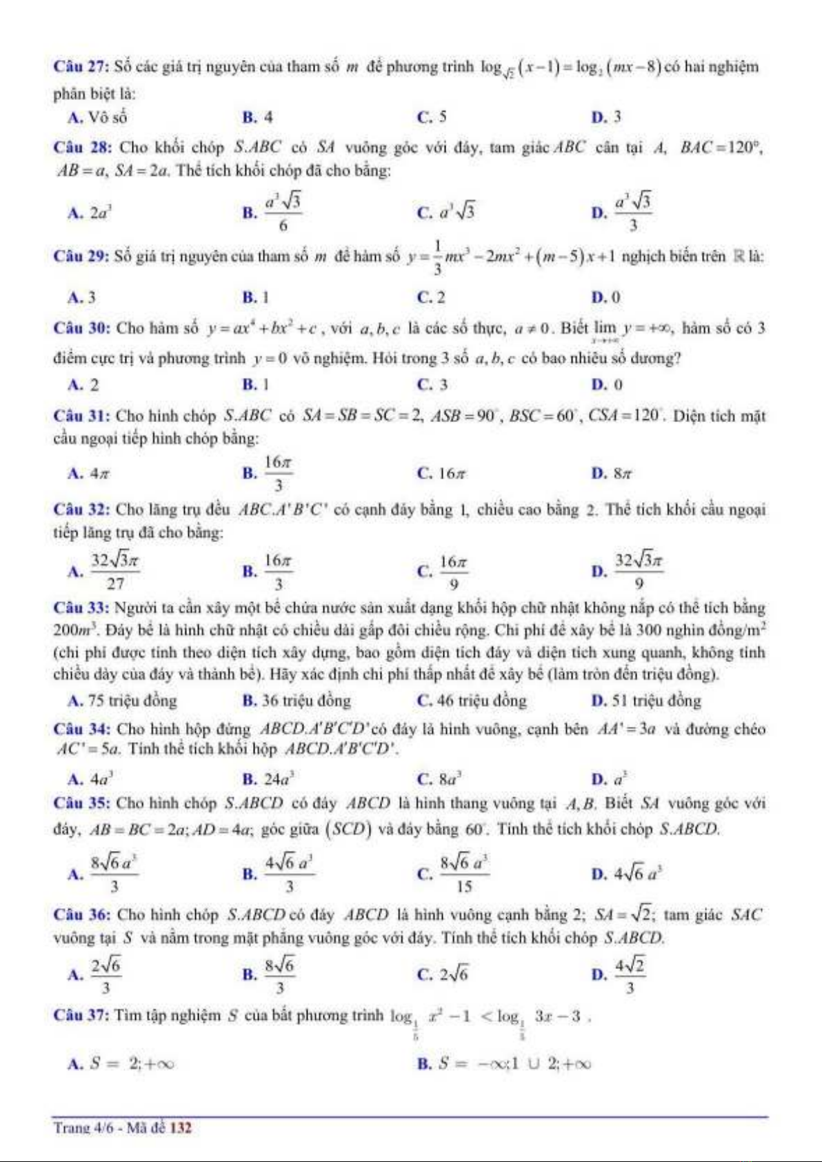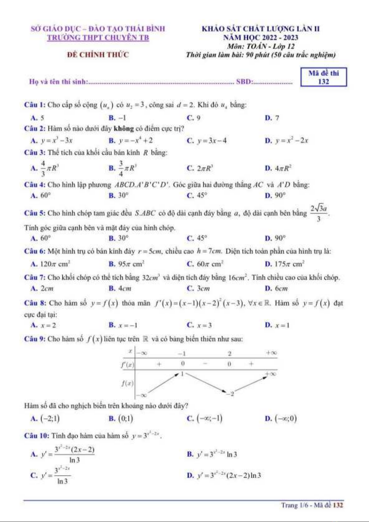 Tài liệu Đề thi KSCL môn Toán lớp 12 năm 2022-2023 có đáp án (Lần 2) - Sở GD&ĐT Thái Bình (Mã đề 132) là tài liệu tham khảo cho học sinh lớp 12 để nâng cao kĩ năng giải đề thi và rèn luyện kiến thức. Nội dung tài liệu chủ yếu tham khảo và xét nghiệm học sinh kĩ năng giải đề toán, cụ thể là trong lúc nghiên cứu môn toán, học sinh sẽ được kiểm tra vào quy trình học tập của mình.