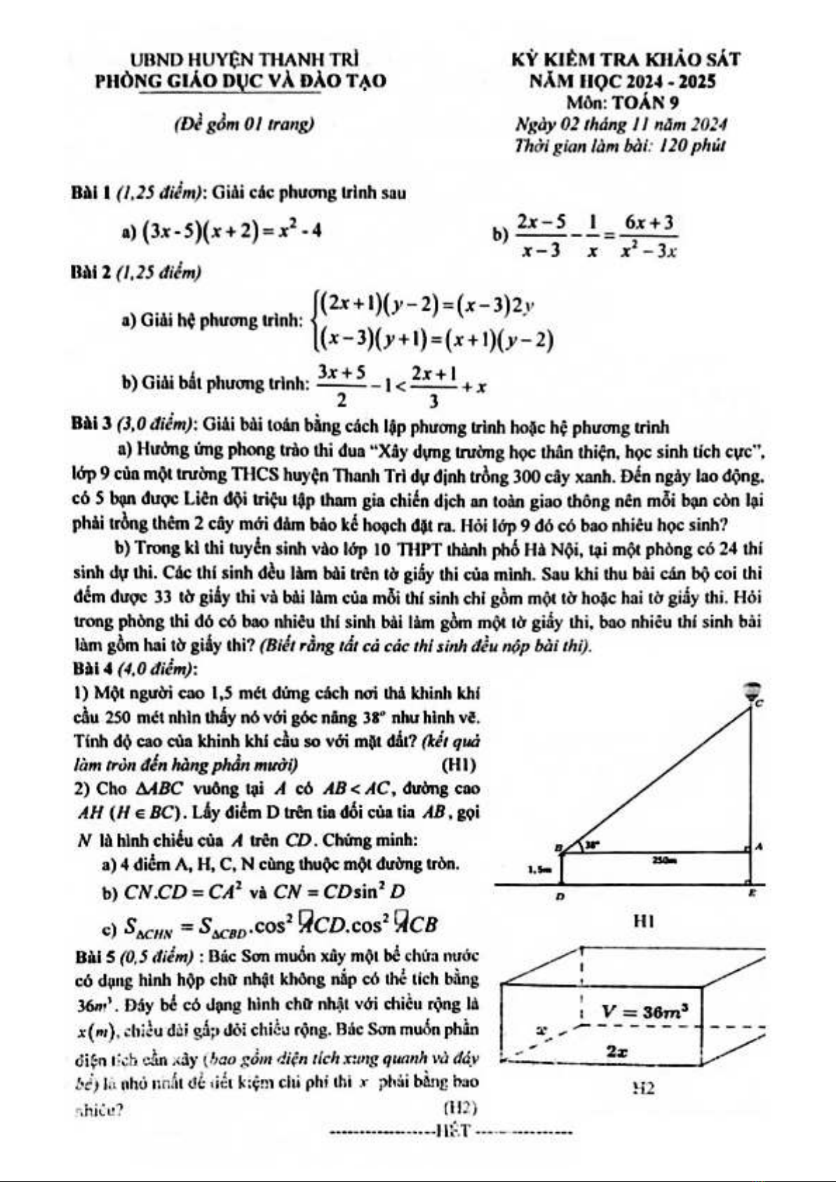 Đề thi KSCL môn Toán lớp 9 năm 2024-2025 - Phòng GD&ĐT Thanh Trì