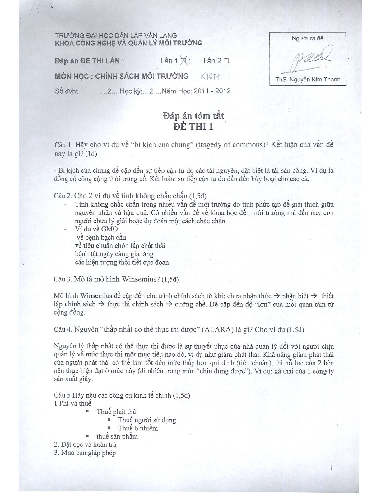 Đề thi lần 1 môn Chính sách môi trường - Trường ĐH Dân Lập Văn Lang