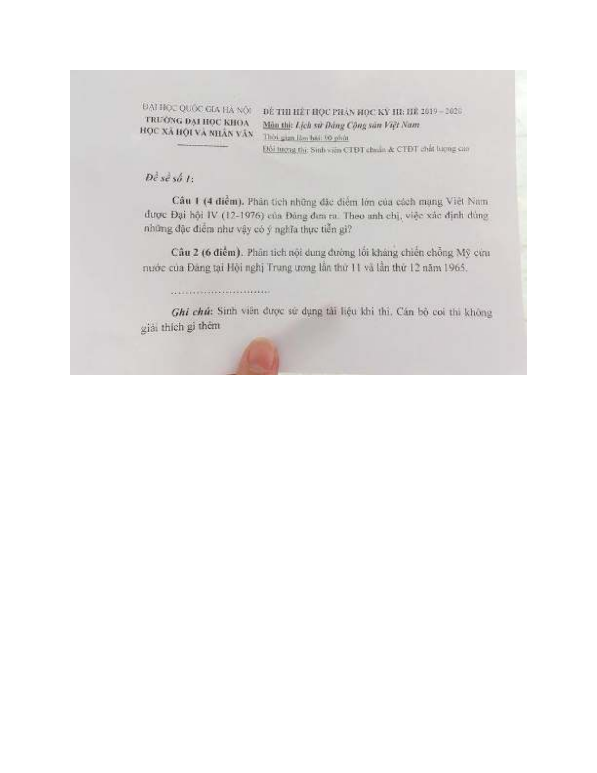 Đề thi cuối học kỳ hè năm học 2019-2020 môn Lịch sử Đảng Cộng sản Việt Nam - ĐH Khoa học Xã hội và Nhân văn