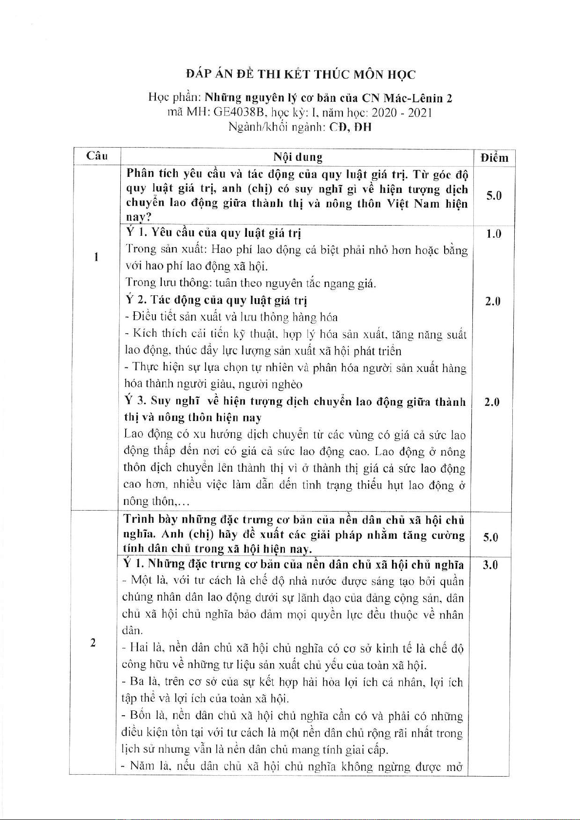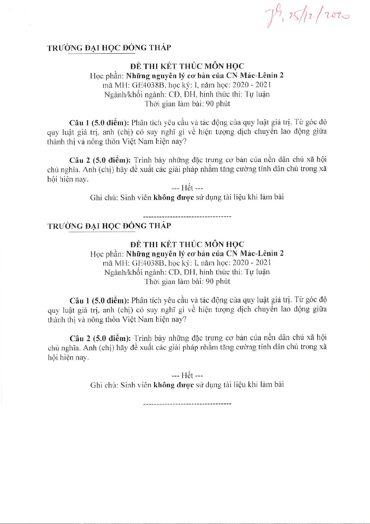 Đề thi kết thúc học phần học kì 1 môn Những nguyên lý cơ bản của chủ nghĩa Mác Lê Nin 2 năm 2020-2021 có đáp án - Trường ĐH Đồng Tháp