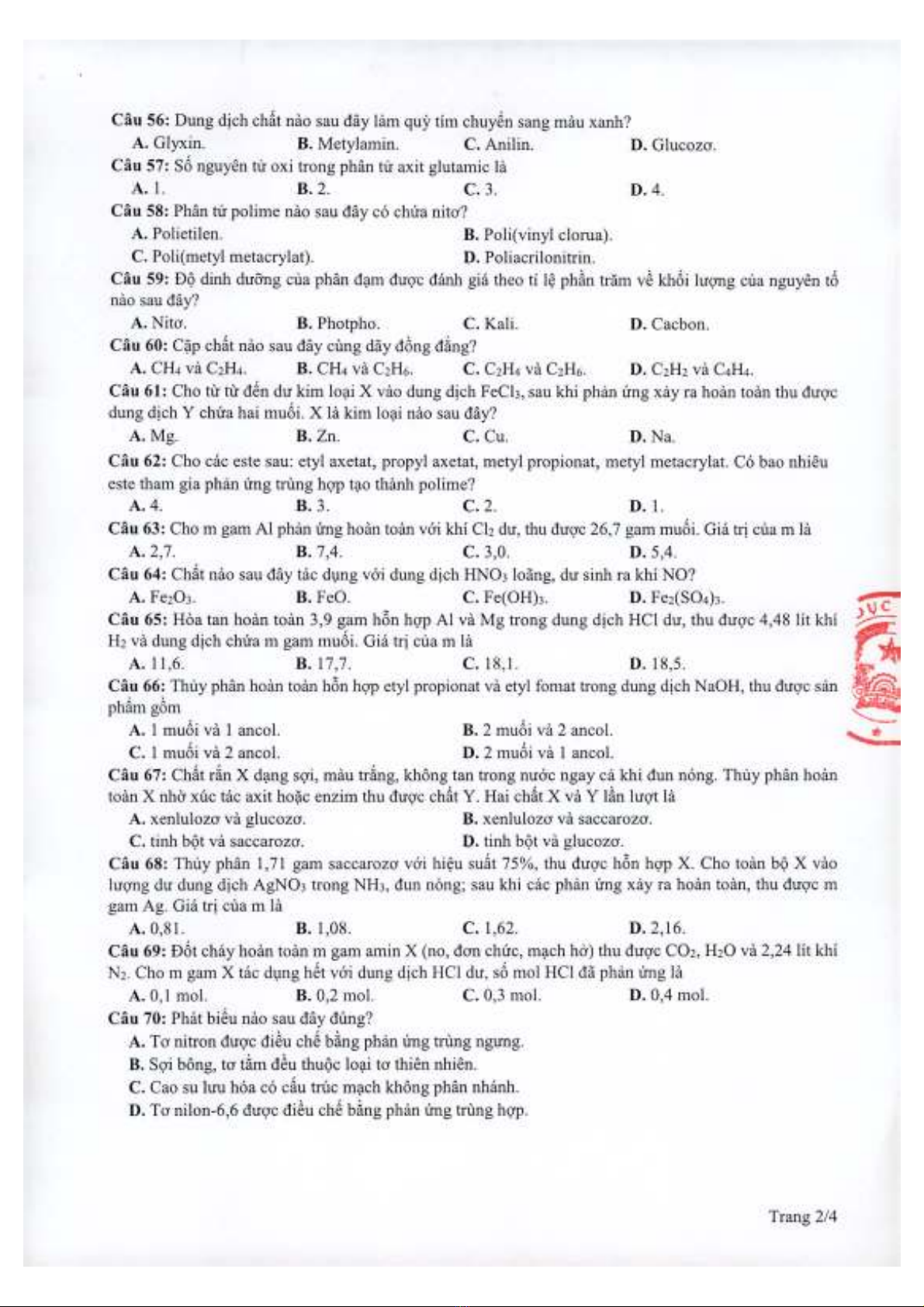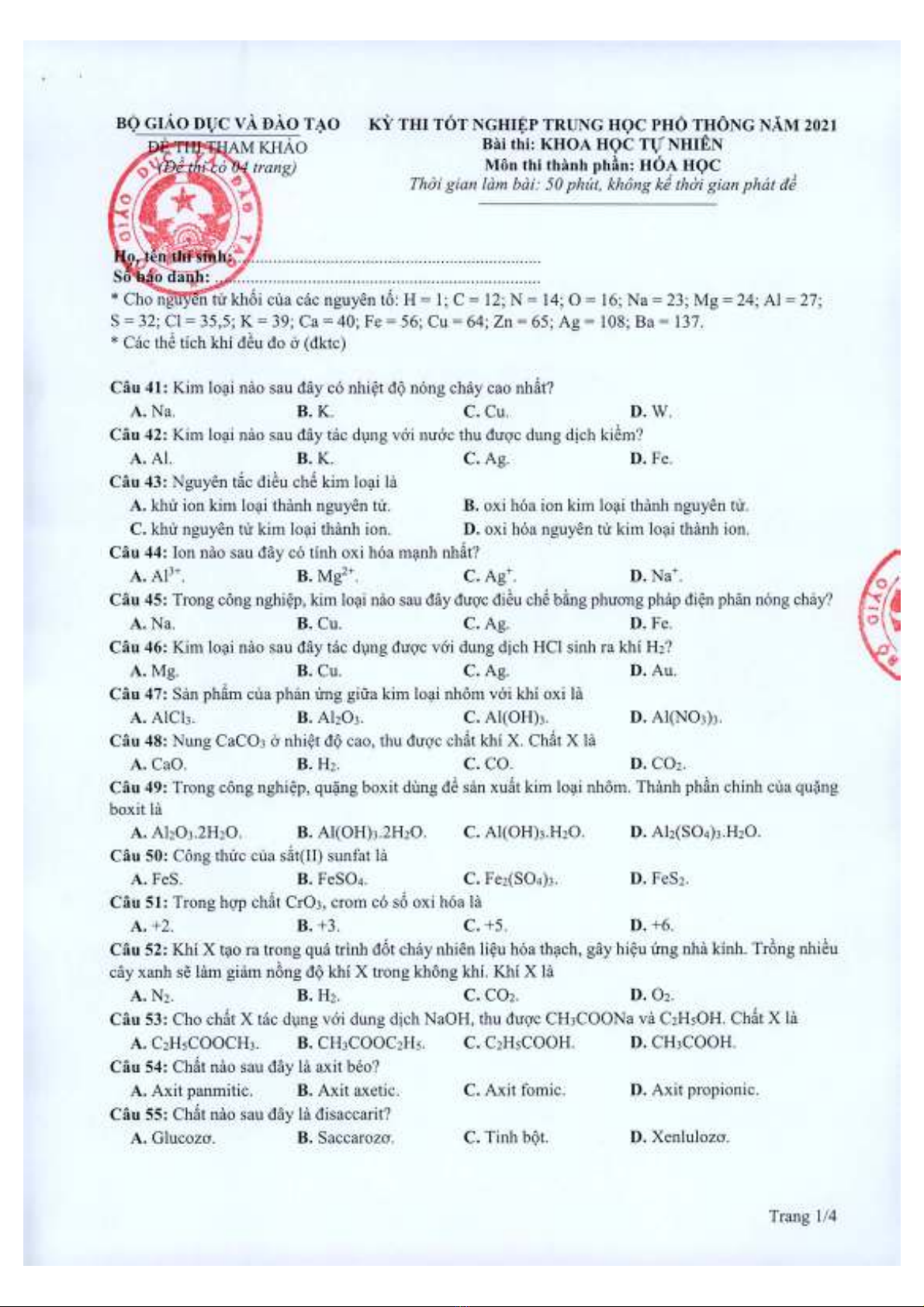 Đề thi minh họa THPT Quốc gia năm 2021 môn Hóa học - Bộ Giáo dục và Đào tạo