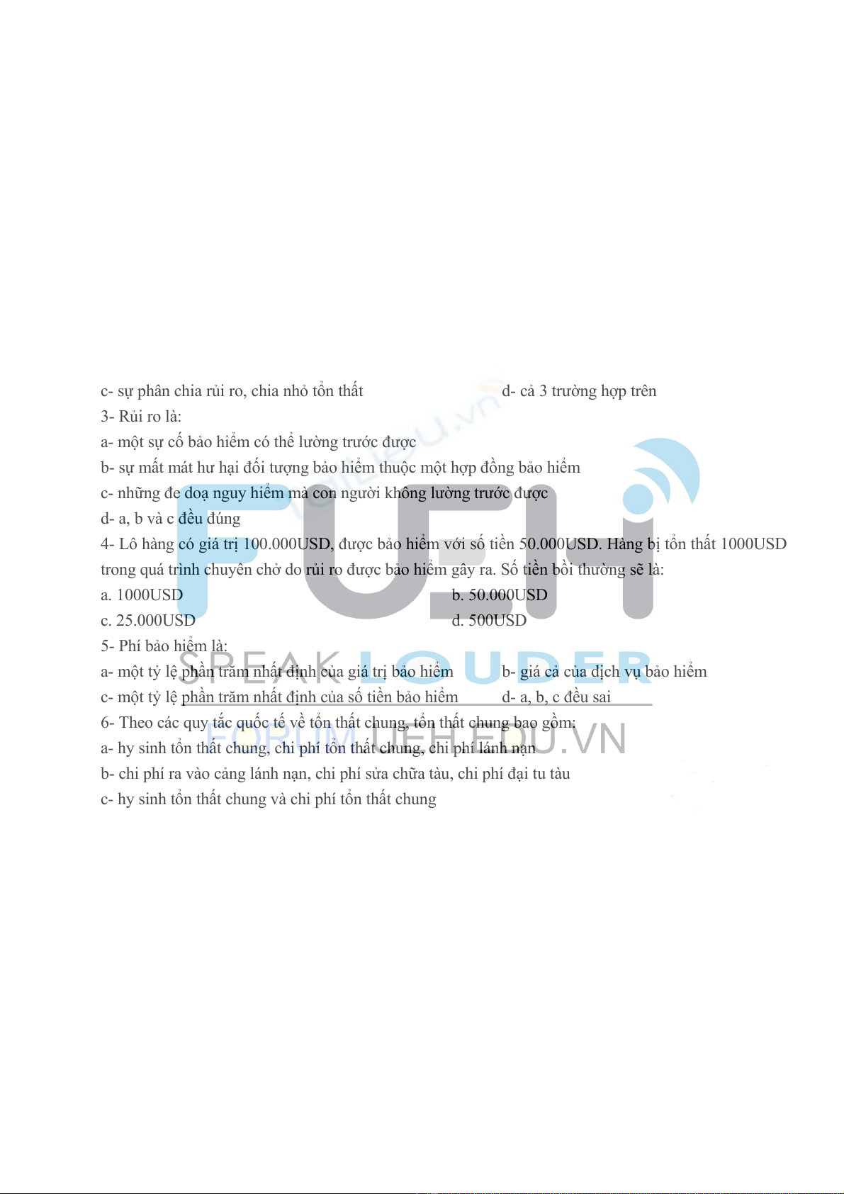 4- Lô hàng có giá trị 100.000USD, được bảo hiểm với số tiền 50.000USD. Hàng bị tổn thất 1000USD