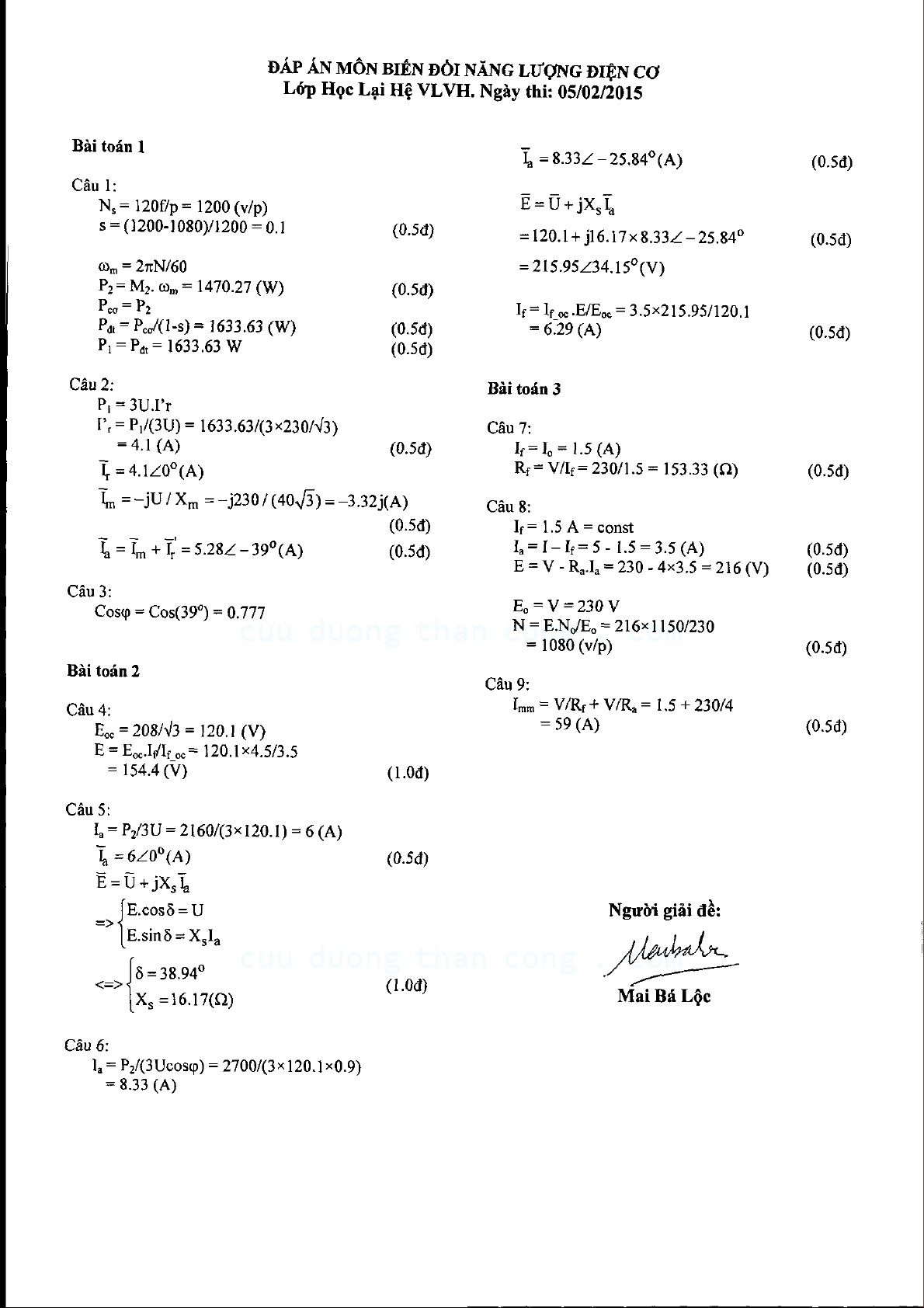 Đề thi môn Biến đổi năng lượng điện cơ - Hệ vừa làm vừa học