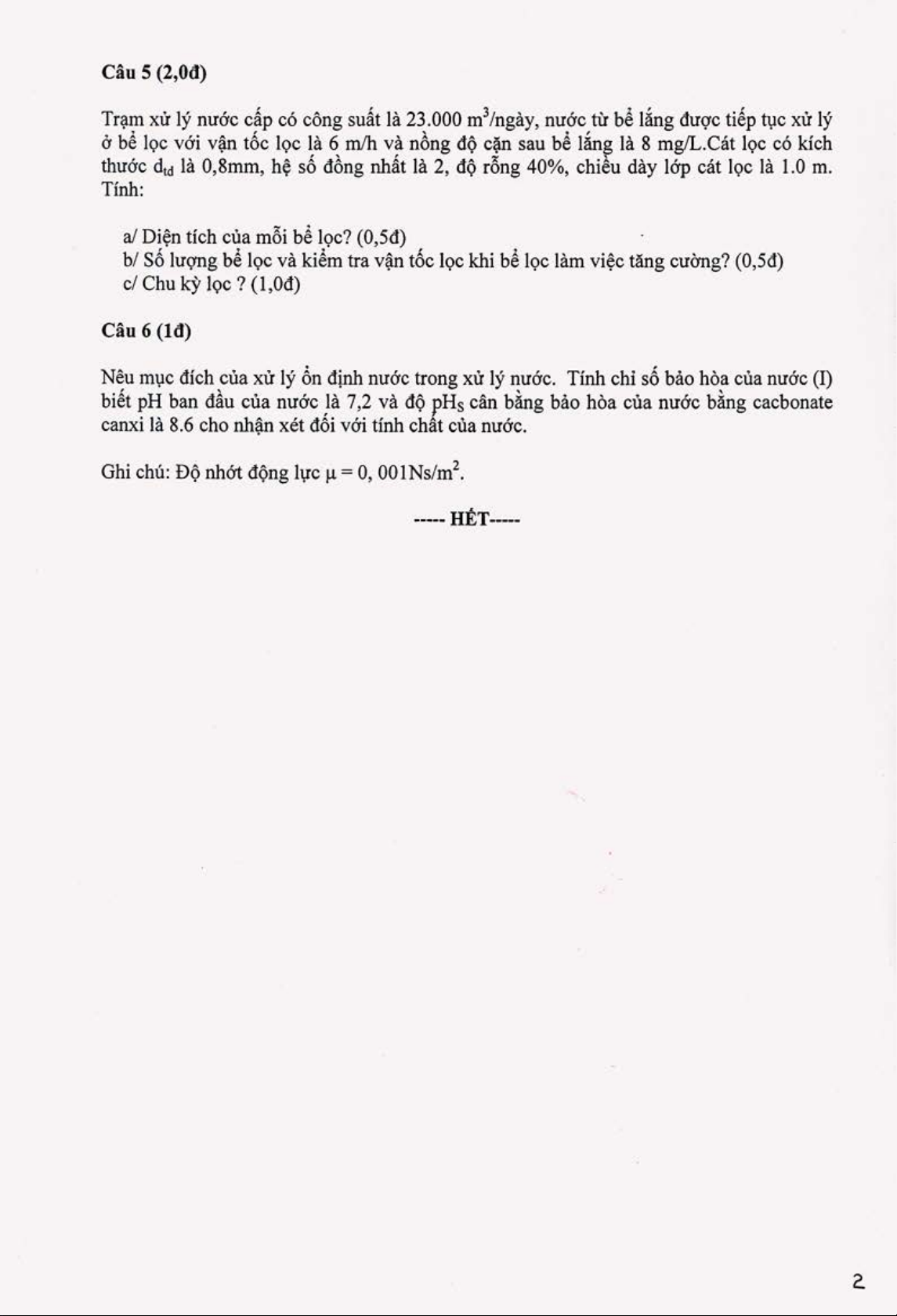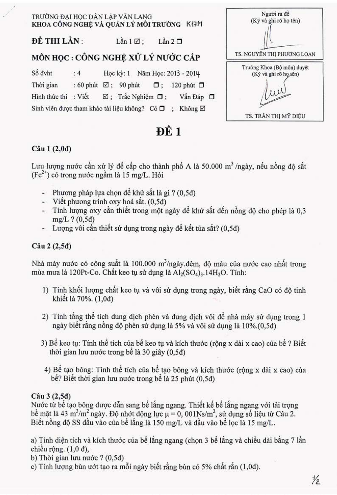 Đề thi môn Công nghệ xử lý nước cấp năm 2013-2014 - ĐH Văn Lang