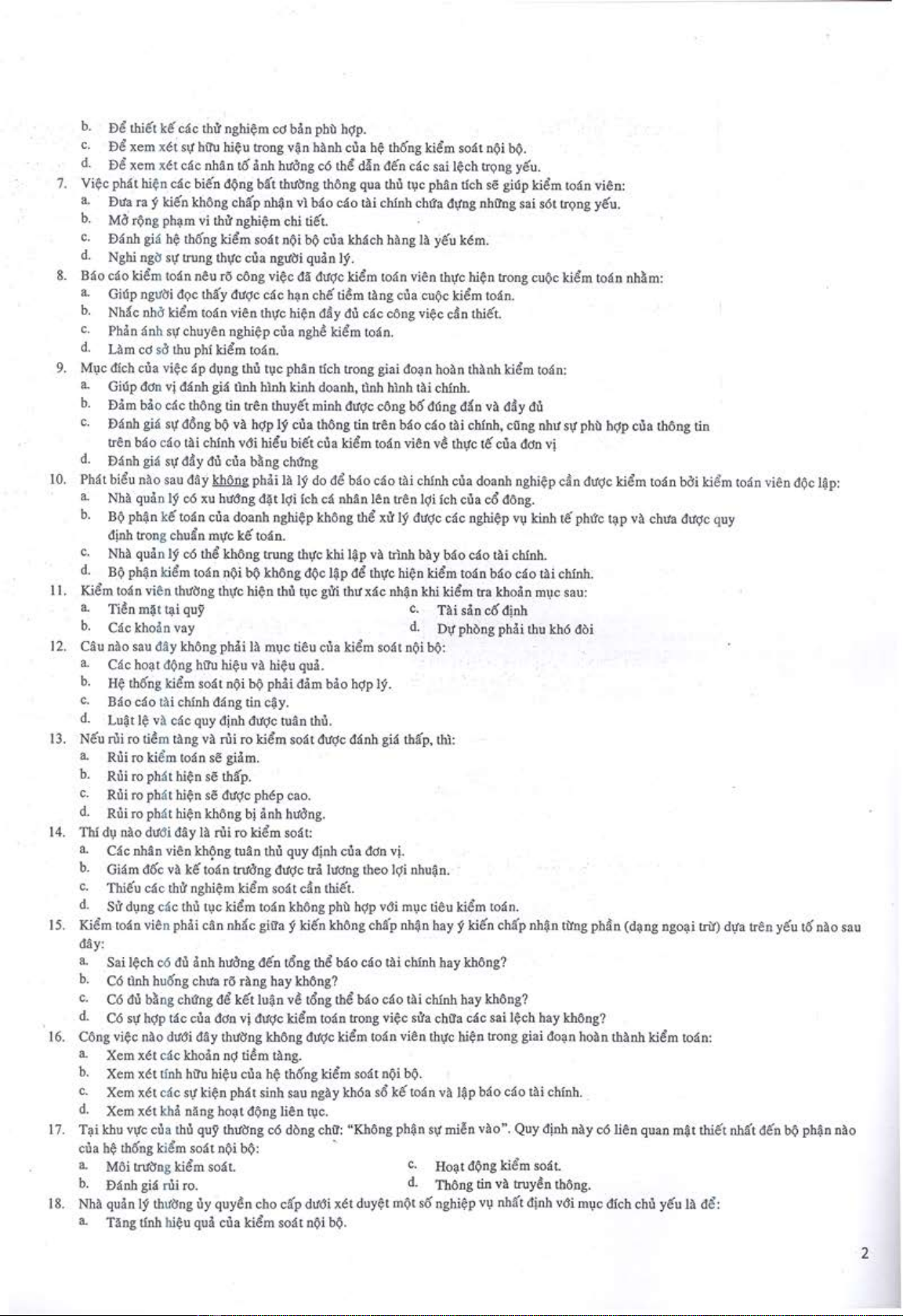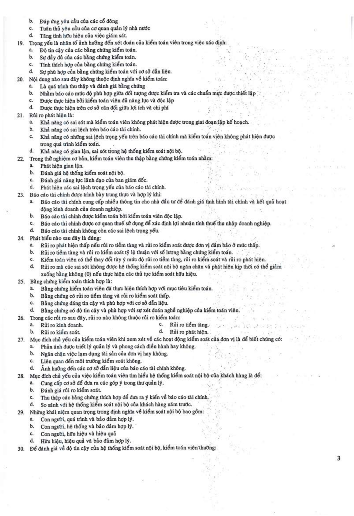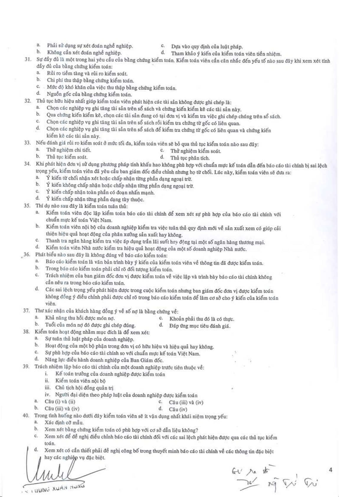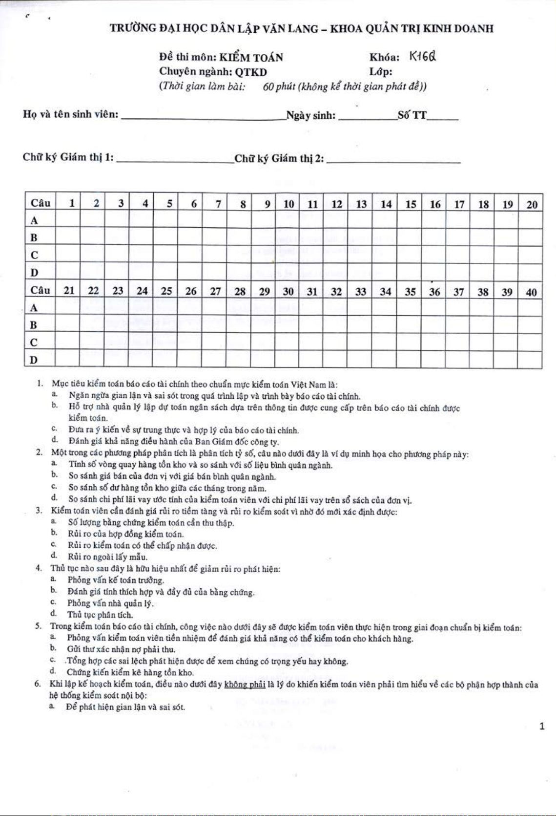 Đề thi môn Kiểm toán năm 2013-2014 - ĐH Văn Lang, đề thi này gồm 40 câu hỏi lý thuyết với hình thức thi trắc nghiệm, thời gian làm bài trong vòng 60 phút. Mời các bạn cùng tham khảo và thử sức mình với đề thi này nhé.