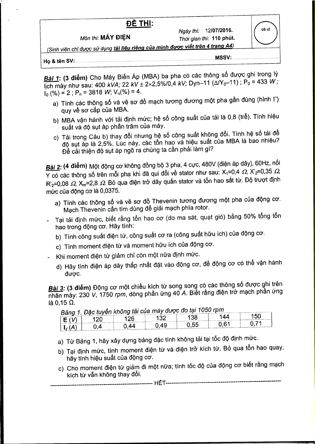 Mời các bạn cùng tham khảo đề thi cuối kỳ môn Máy điện của Trường Đại học Bách Khoa Tp.HCM. Đề thi gồm có 3 câu hỏi có kèm đáp án để người đọc làm quen với cấu trúc và cách làm bài. Cùng tìm hiểu và tham khảo nội dung thông tin tài liệu.