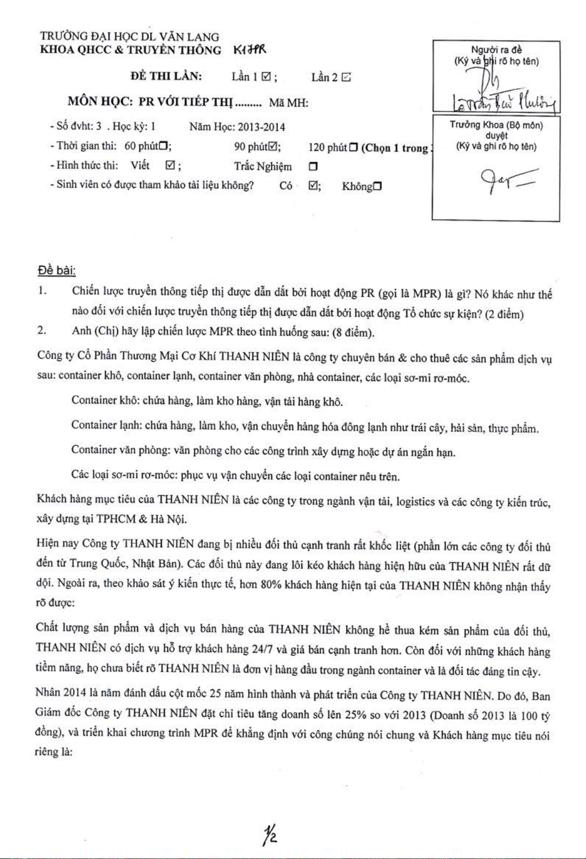 Đề thi môn PR với tiếp thị năm 2013-2014 - ĐH Văn Lang