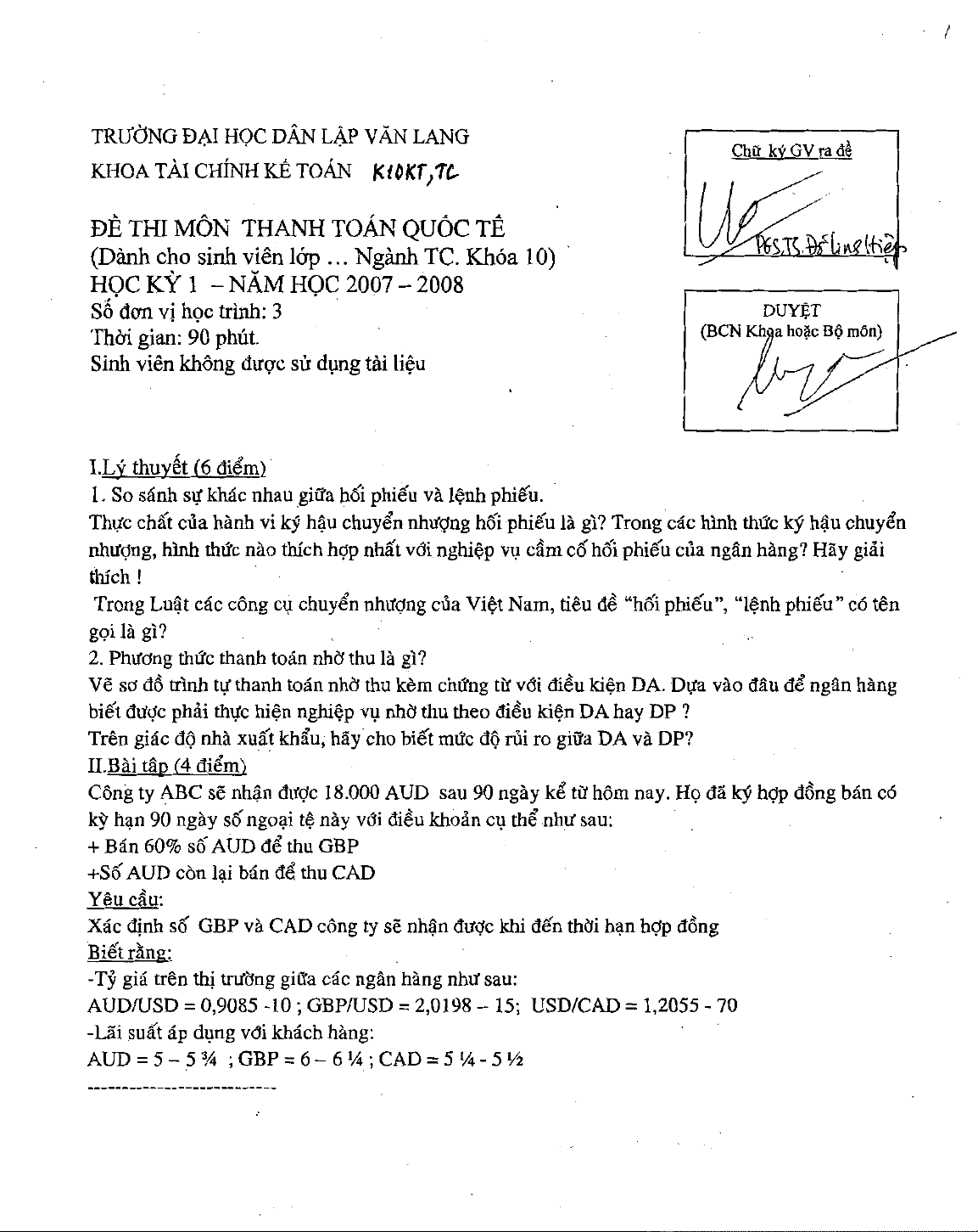 Đề thi môn Thanh toán quốc tế - HKI năm 2007-2008