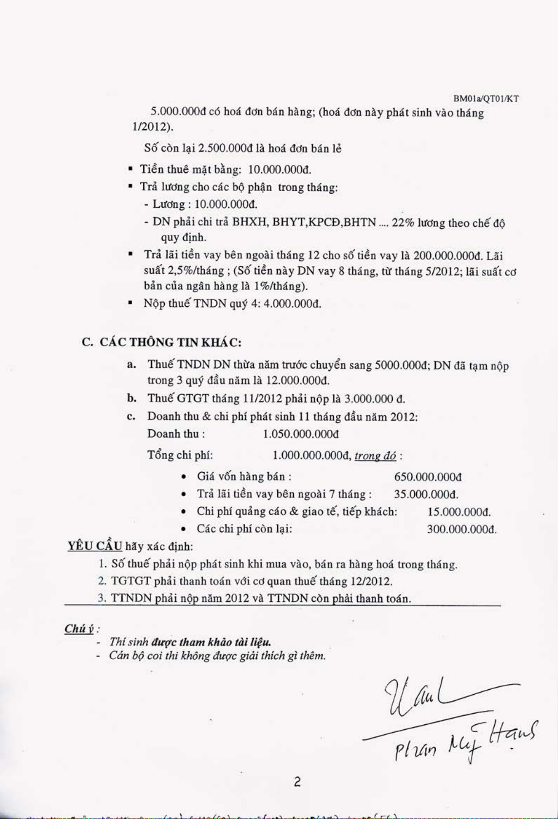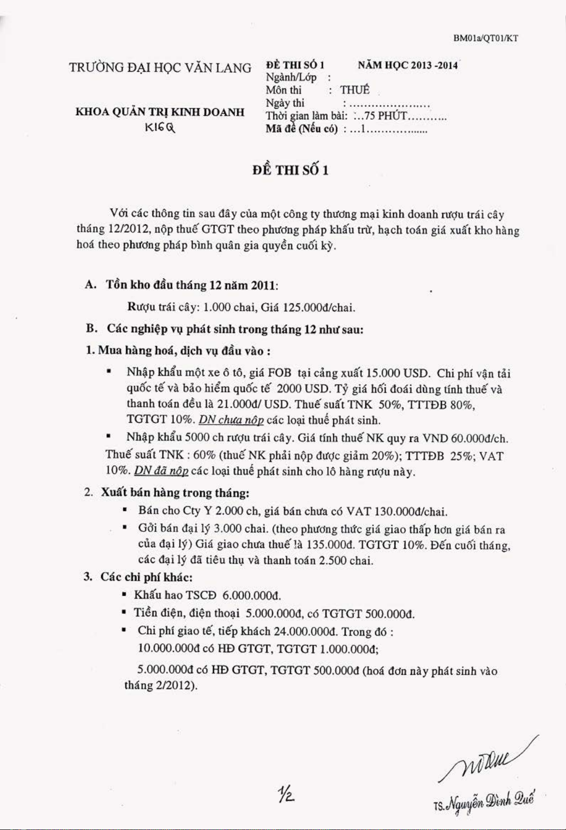 Đề thi số 1 môn Thuế năm 2013-2014 - ĐH Văn Lang