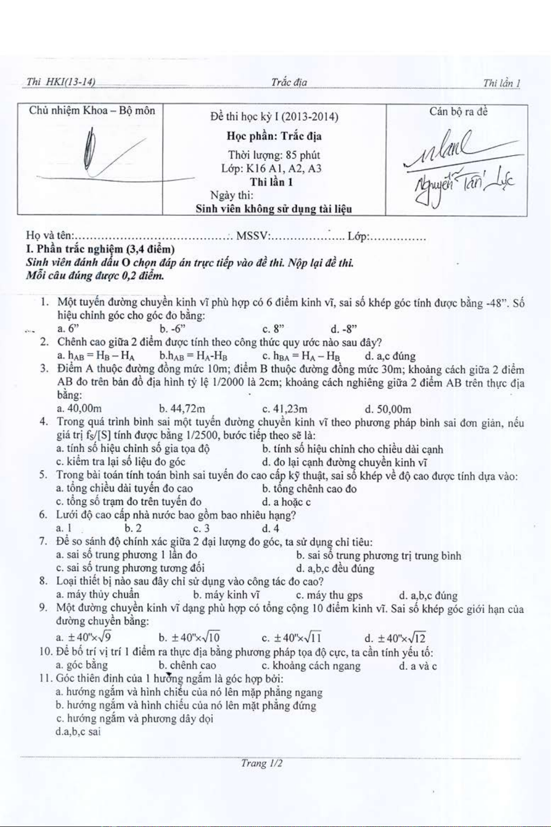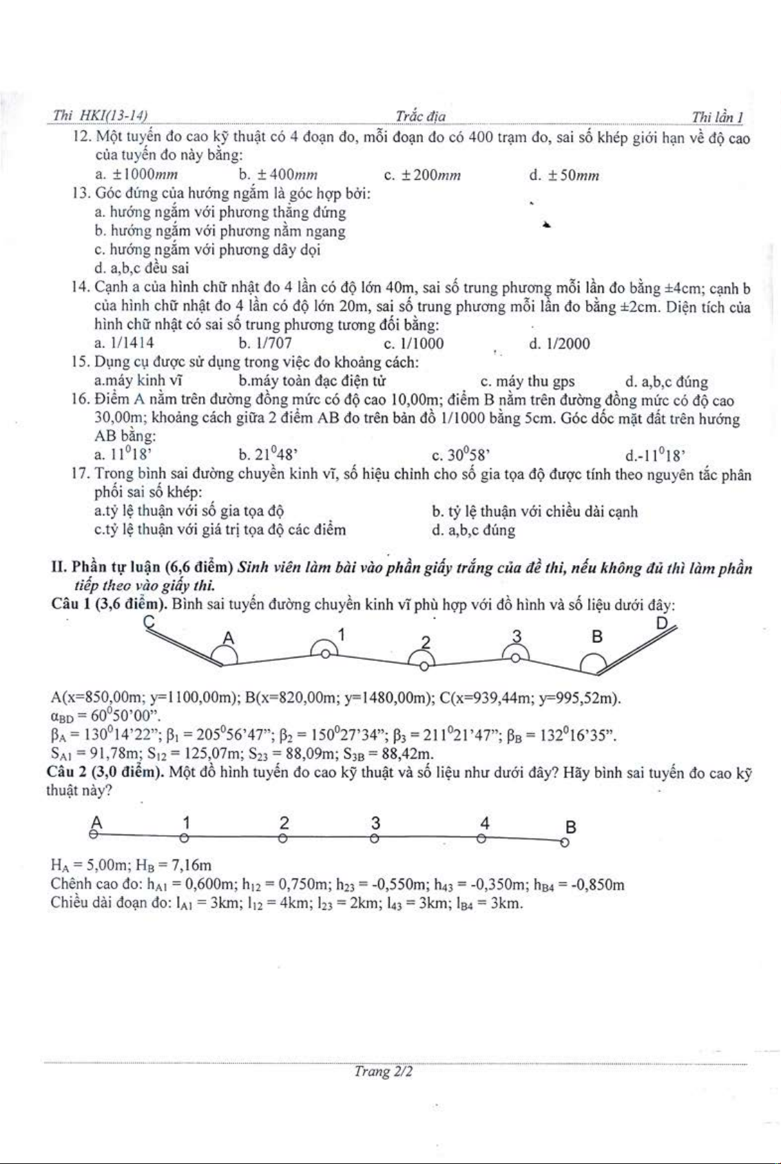 Đề thi môn Trắc địa năm 2013-2014 - ĐH Văn Lang