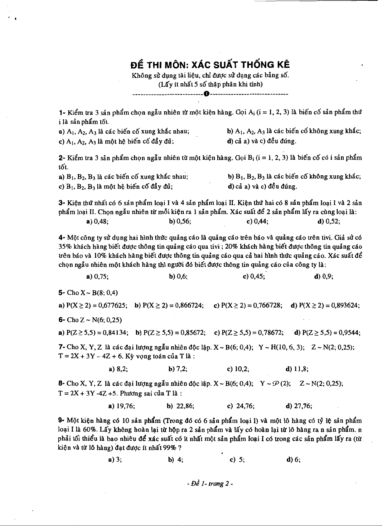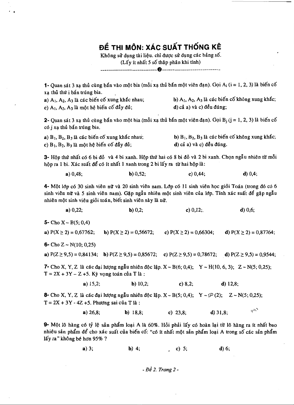 Đề thi môn Xác suất thống kê (không sử dụng tài liệu, chỉ được sử dụng các bảng số)