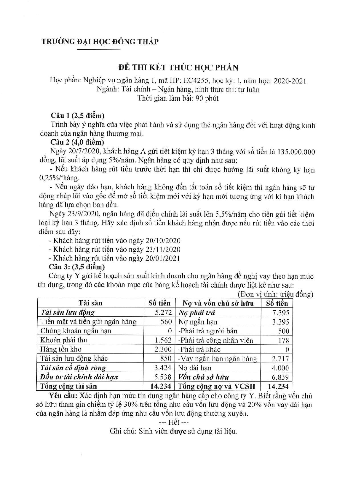 Đây là đề thi kết thúc học phần Nghiệp vụ ngân hàng 1 (mã HP: EC4255) của Trường Đại học Đồng Tháp, dành cho sinh viên ngành Tài chính - Ngân hàng, học kỳ I, năm học 2020-2021. Đề thi bao gồm các câu hỏi tự luận tập trung vào các nghiệp vụ cơ bản của ngân hàng thương mại.