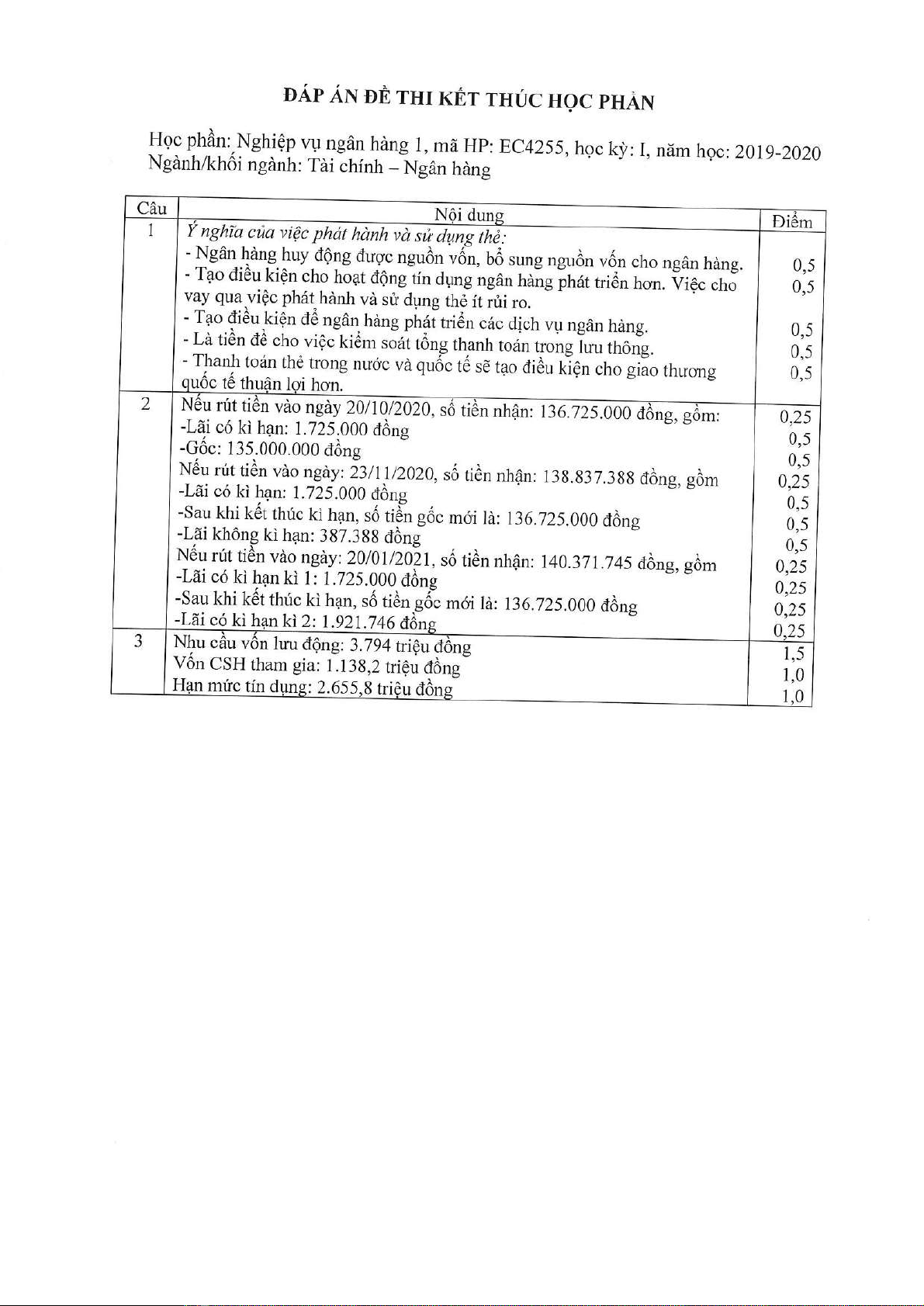 Tài liệu này là đề thi kết thúc học phần Nghiệp vụ ngân hàng 1, được thiết kế để đánh giá kiến thức và kỹ năng của sinh viên ngành Tài chính - Ngân hàng. Đề thi gồm ba câu hỏi chính. Câu 1 yêu cầu trình bày ý nghĩa của việc phát hành và sử dụng thẻ ngân hàng đối với hoạt động kinh doanh của ngân hàng thương mại, bao gồm các khía cạnh về huy động vốn, phát triển tín dụng, dịch vụ ngân hàng, kiểm soát thanh toán và giao thương quốc tế. Câu 2 là một bài toán thực tế về tính toán tiền lãi và số tiền nhận được từ một khoản tiền gửi tiết kiệm có kỳ hạn, với các tình huống phức tạp như rút tiền trước hạn, tự động nhập lãi vào gốc khi đáo hạn, và sự thay đổi của lãi suất theo thời gian. Sinh viên cần xác định số tiền khách hàng nhận được tại các thời điểm rút tiền khác nhau. Câu 3 tập trung vào phân tích tài chính doanh nghiệp để xác định hạn mức tín dụng mà ngân hàng có thể cấp cho một công ty, dựa trên bảng kế hoạch tài chính (tài sản lưu động, nợ phải trả, vốn chủ sở hữu) và các yêu cầu về vốn lưu động, vốn vay dài hạn. Tài liệu cũng cung cấp đáp án chi tiết cho từng câu hỏi, giúp sinh viên và giảng viên tham khảo.