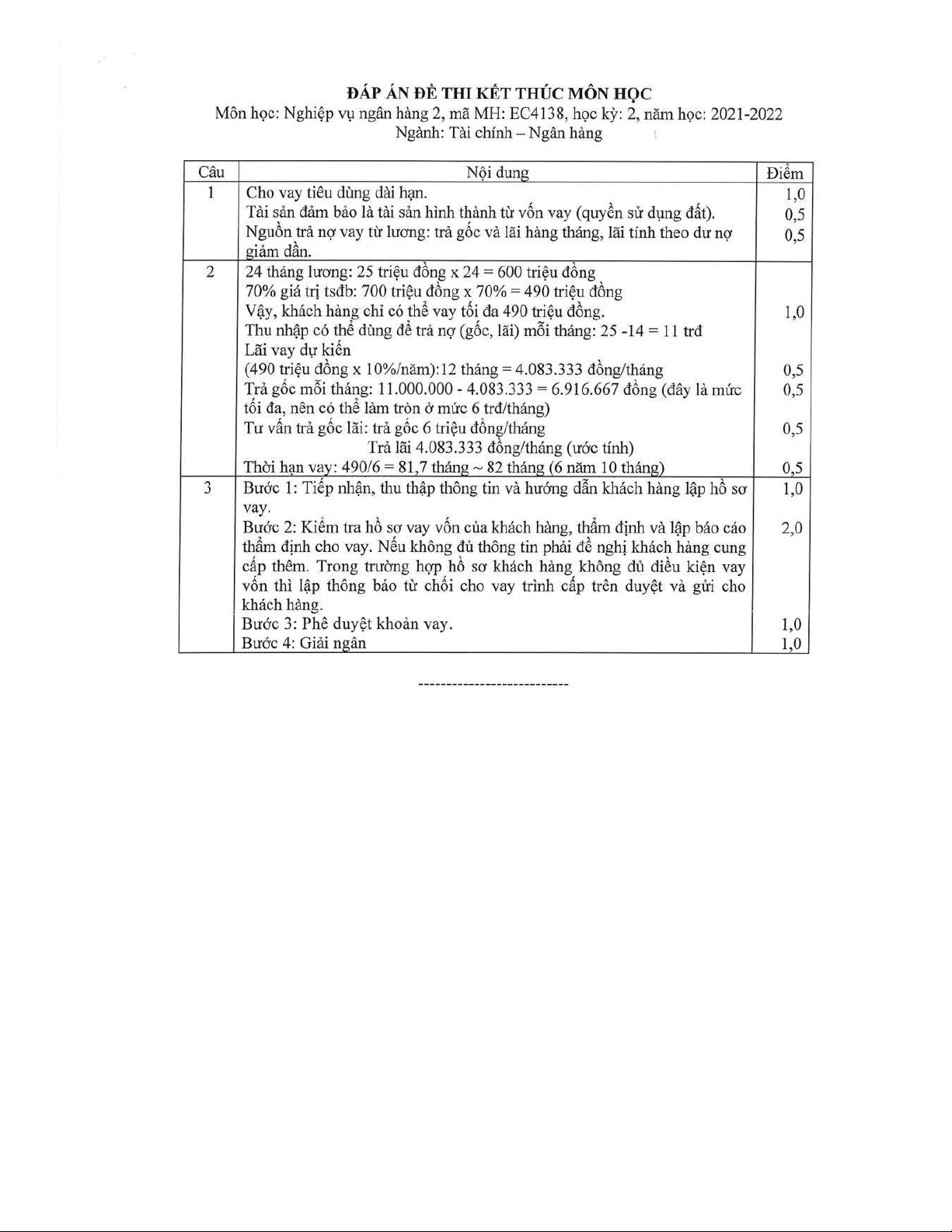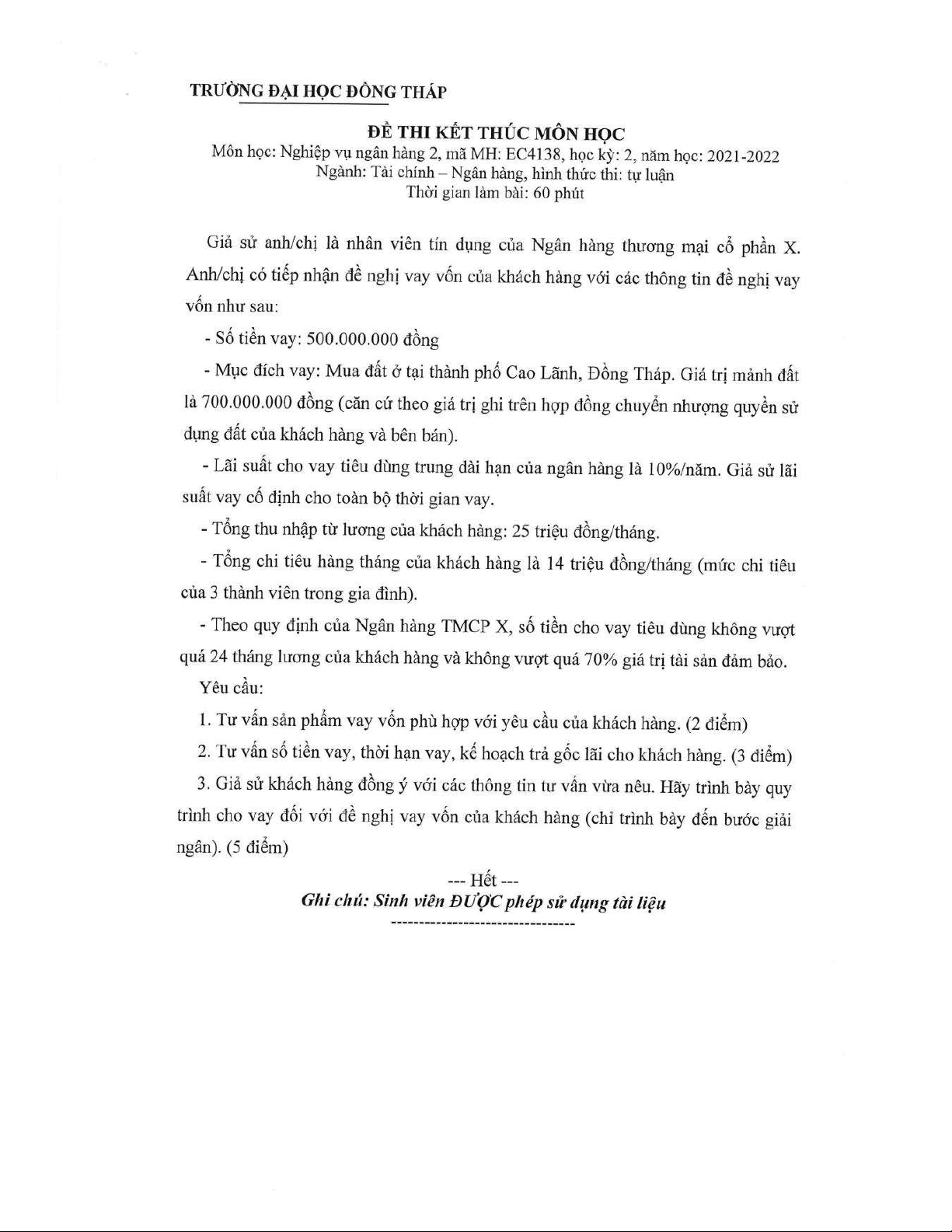 Đề thi kết thúc học phần học kì 2 môn Nghiệp vụ ngân hàng 2 năm 2021-2022 có đáp án - Trường ĐH Đồng Tháp