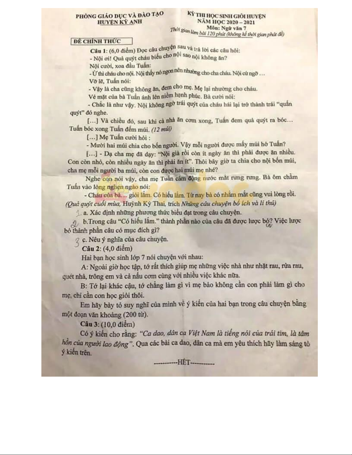 Đề thi học sinh giỏi môn Ngữ văn lớp 7 cấp huyện năm 2020-2021 - Phòng GD&ĐT Kỳ Anh
