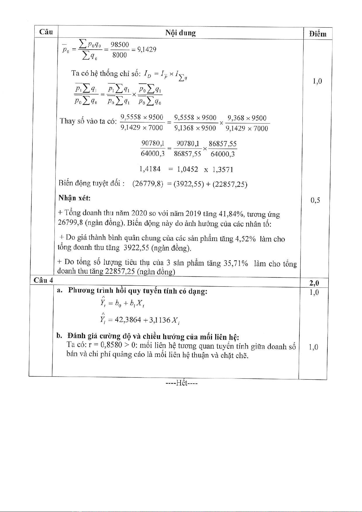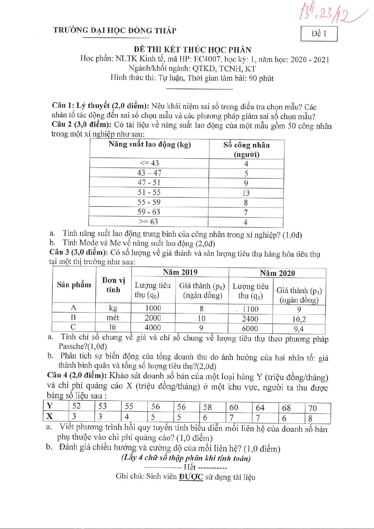 Đề thi kết thúc học phần học kì 1 môn Nguyên lý thống kê kinh tế năm 2020-2021 có đáp án - Trường ĐH Đồng Tháp