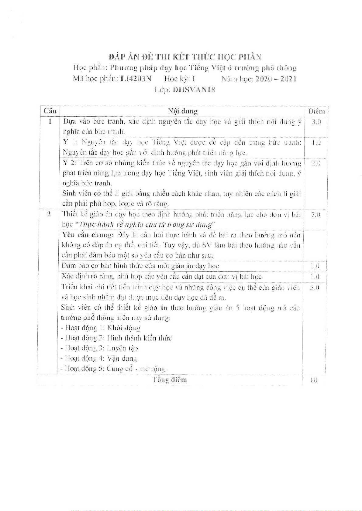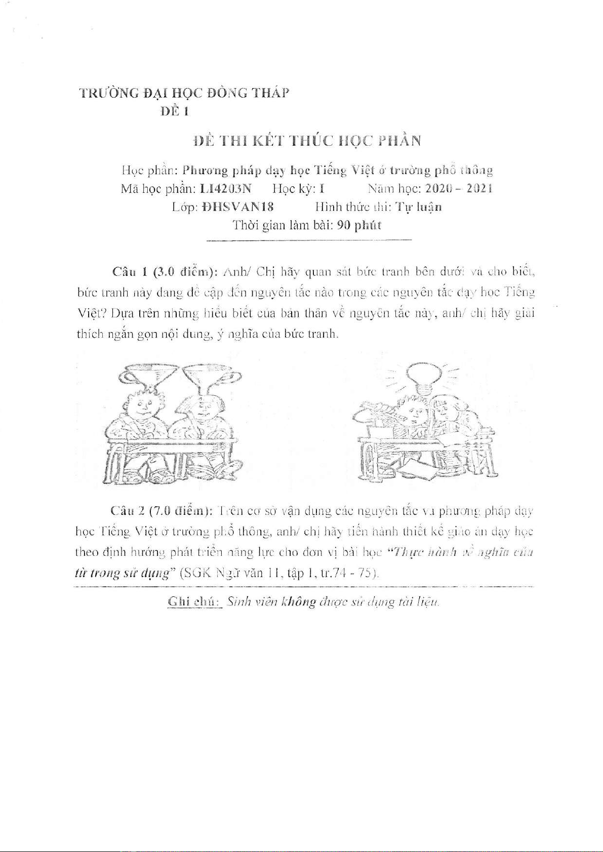 Đề thi kết thúc học phần học kì 1 môn Phương pháp dạy học Tiếng Việt ở trường phổ thông năm 2020-2021 có đáp án - Trường ĐH Đồng Tháp