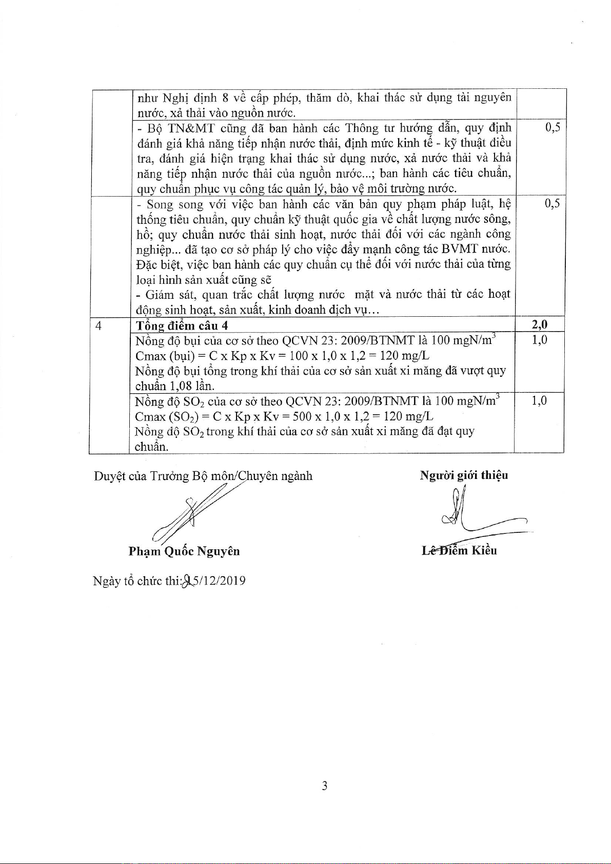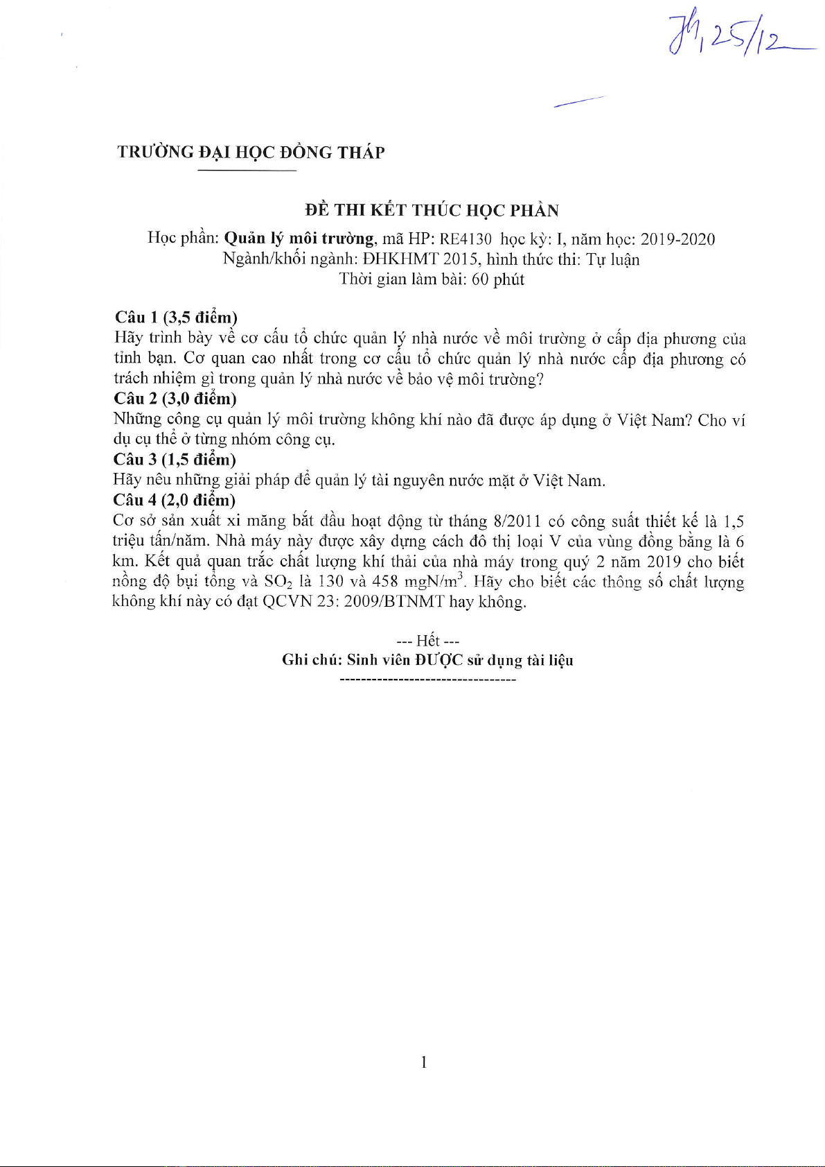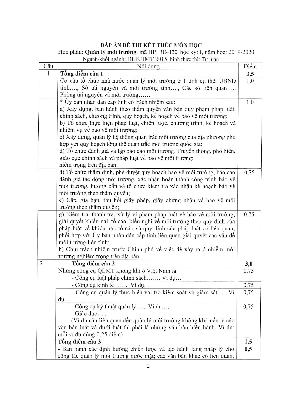 Đề thi kết thúc học phần học kì 1 môn Quản lý môi trường năm 2019-2020 có đáp án - Trường ĐH Đồng Tháp