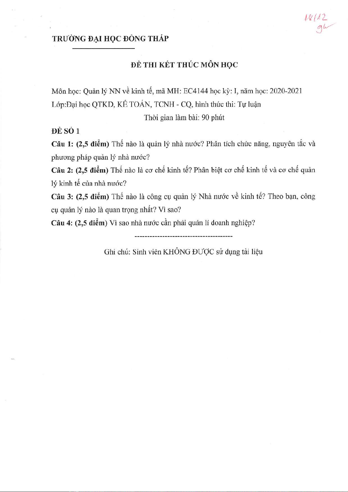 Đề thi kết thúc học phần học kì 1 môn Quản lý nhà nước về kinh tế năm 2020-2021 có đáp án - Trường ĐH Đồng Tháp
