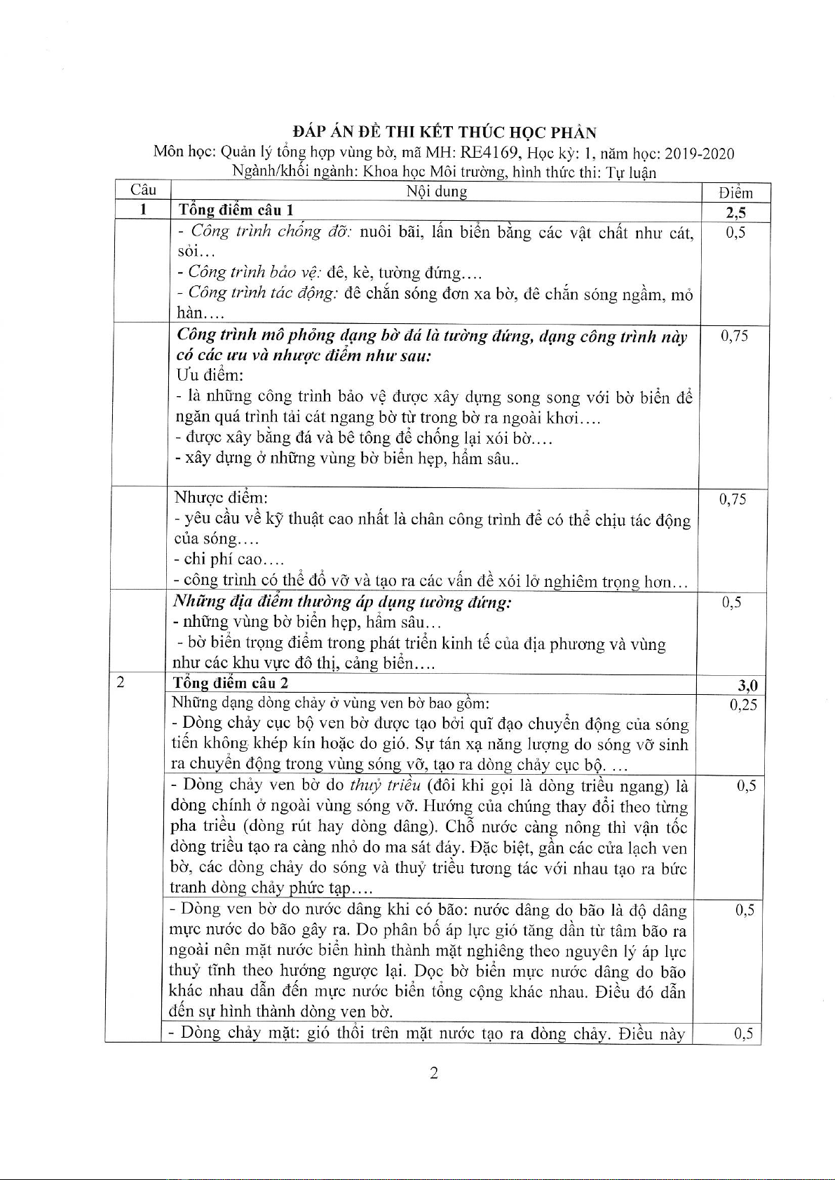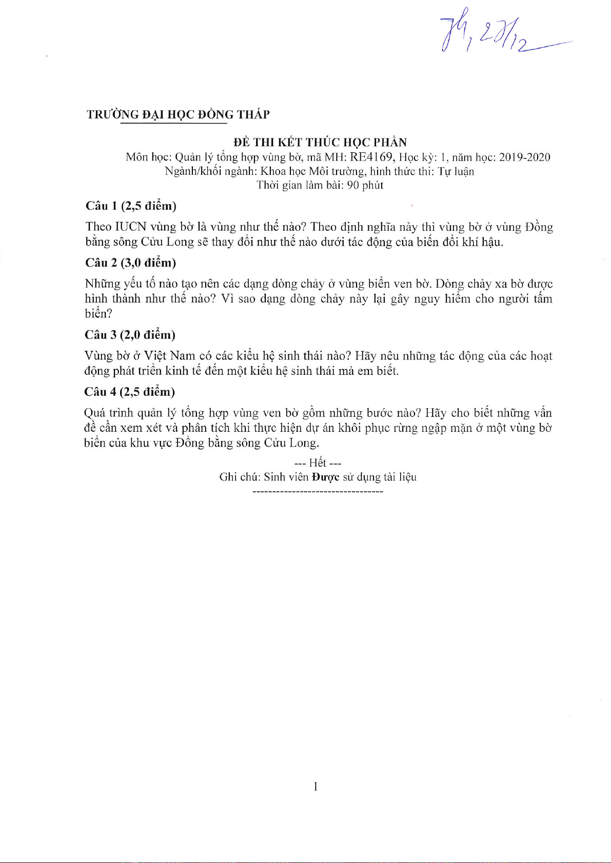 Đề thi kết thúc học phần học kì 1 môn Quản lý tổng hợp vùng bờ năm 2019-2020 có đáp án - Trường ĐH Đồng Tháp