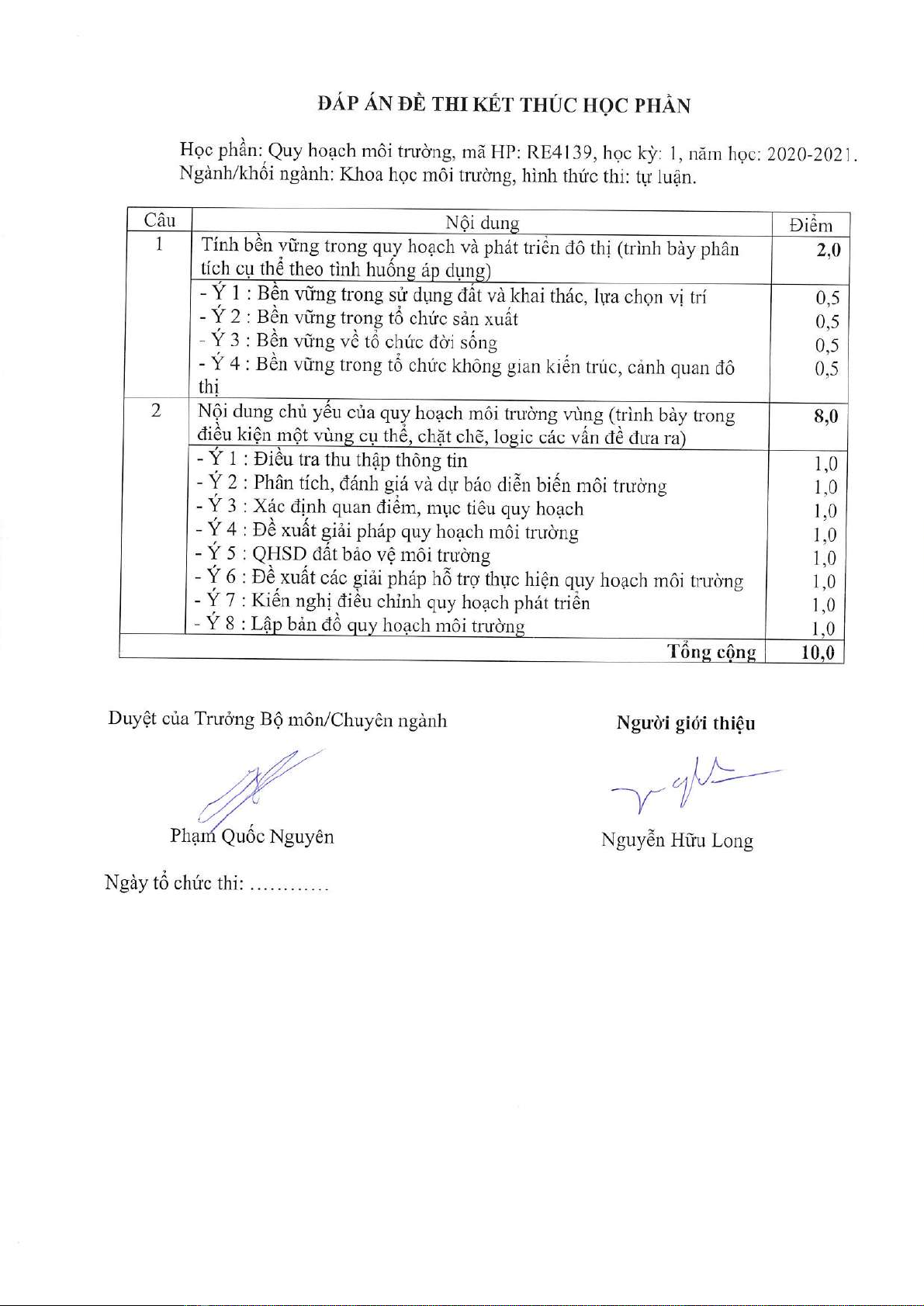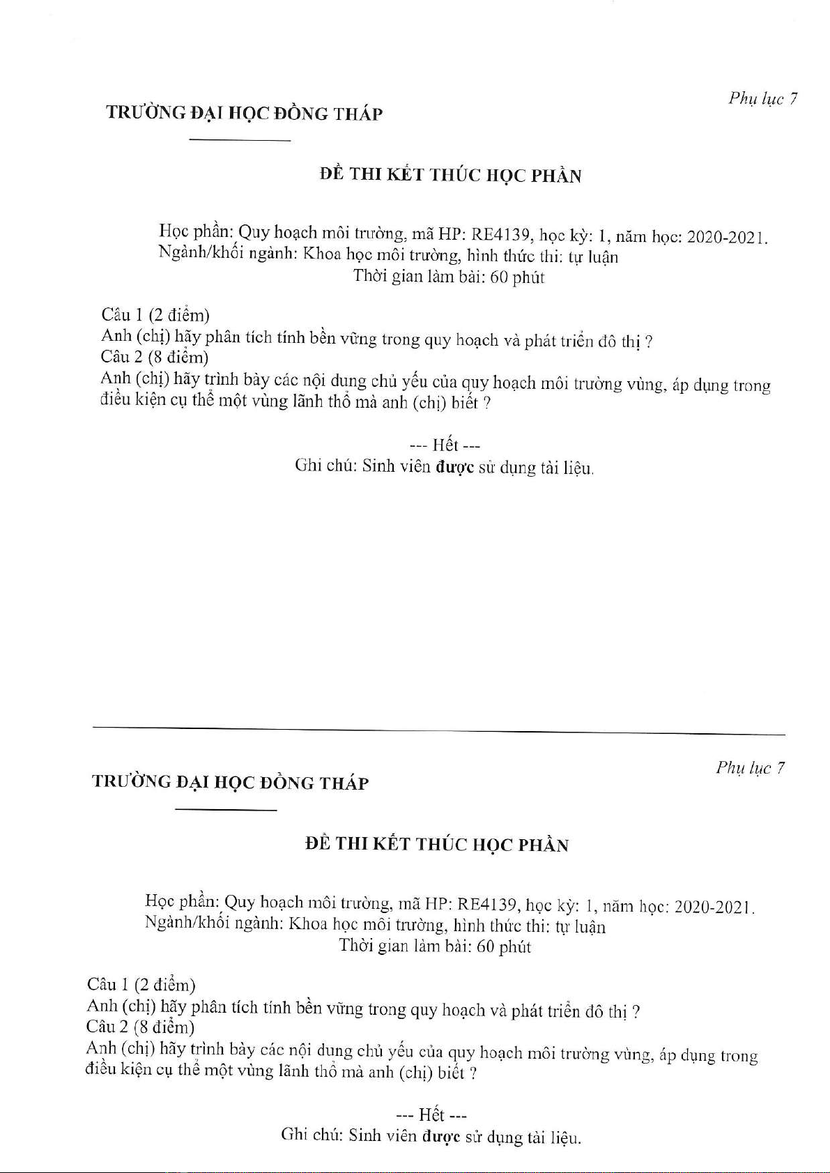 Đề thi kết thúc học phần học kì 1 môn Quy hoạch môi trường năm 2020-2021 có đáp án - Trường ĐH Đồng Tháp
