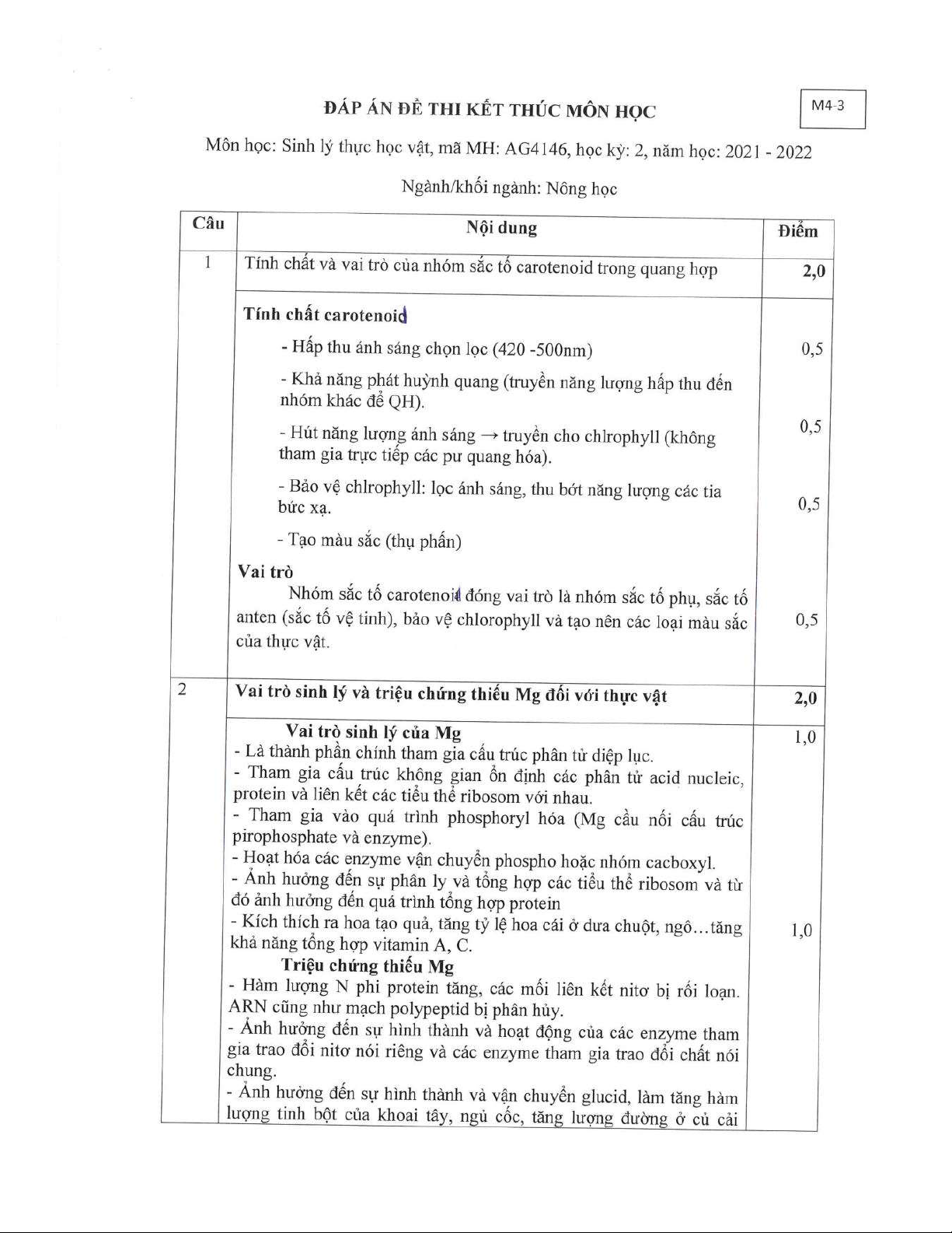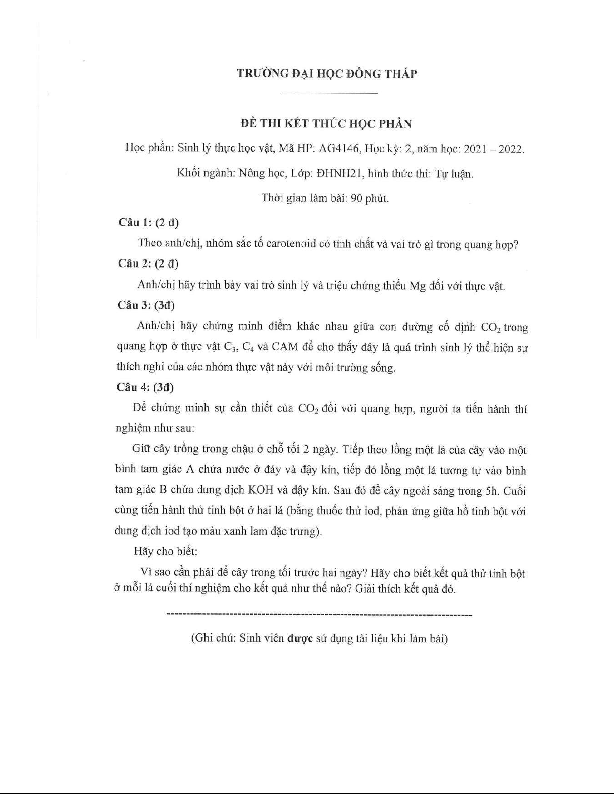 Đề thi kết thúc học phần học kì 2 môn Sinh vật thực vật học năm 2021-2022 có đáp án - Trường ĐH Đồng Tháp