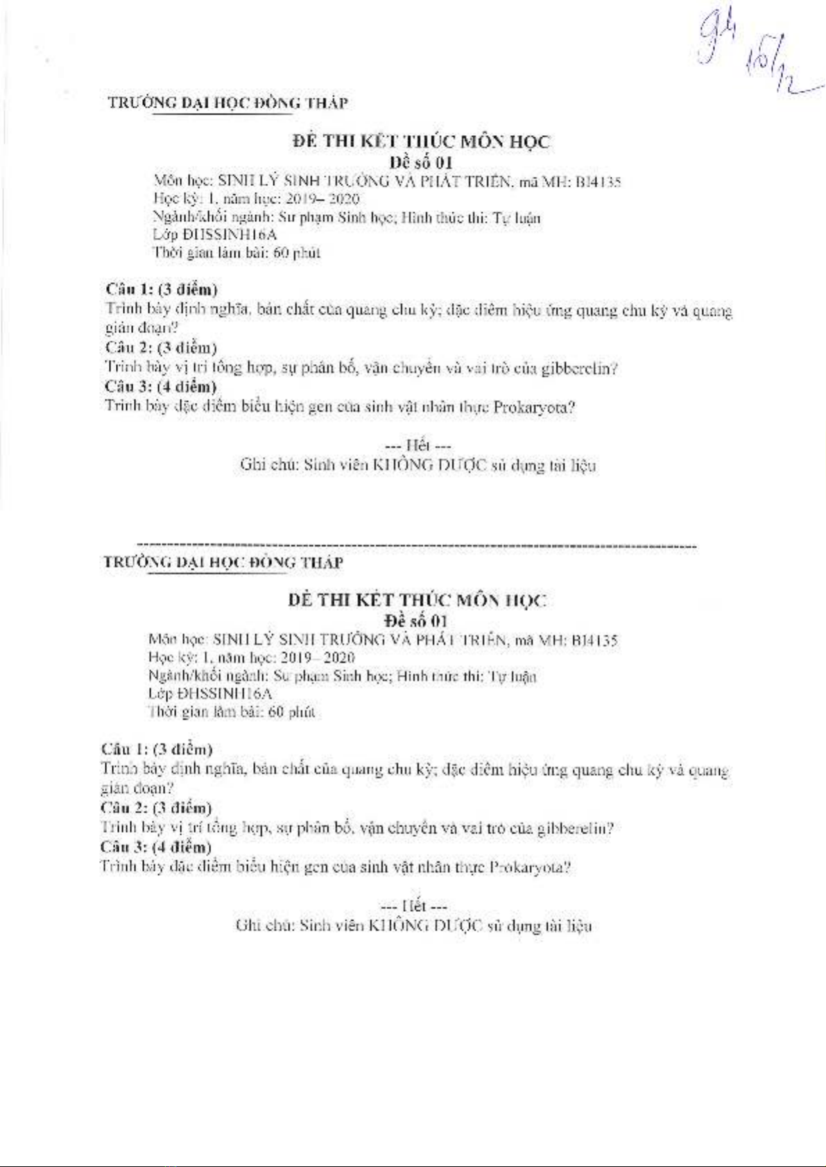 Đề thi kết thúc môn học Sinh lý sinh trưởng và phát triển năm 2019-2020 có đáp án - Trường ĐH Đồng Tháp
