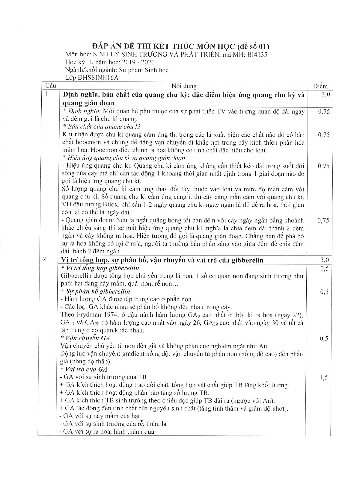 Đề thi kết thúc học phần học kì 1 môn Sinh lý sinh trưởng và phát triển năm 2019-2020 có đáp án - Trường ĐH Đồng Tháp