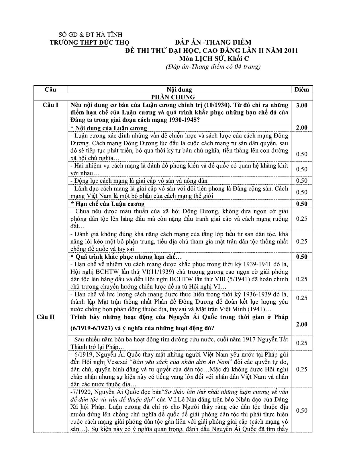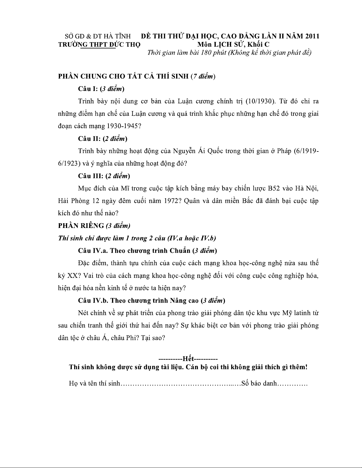 Đề thi thử đại học, cao đẳng lần 2 năm 2012 môn lịch sử - THPT Đức Thọ