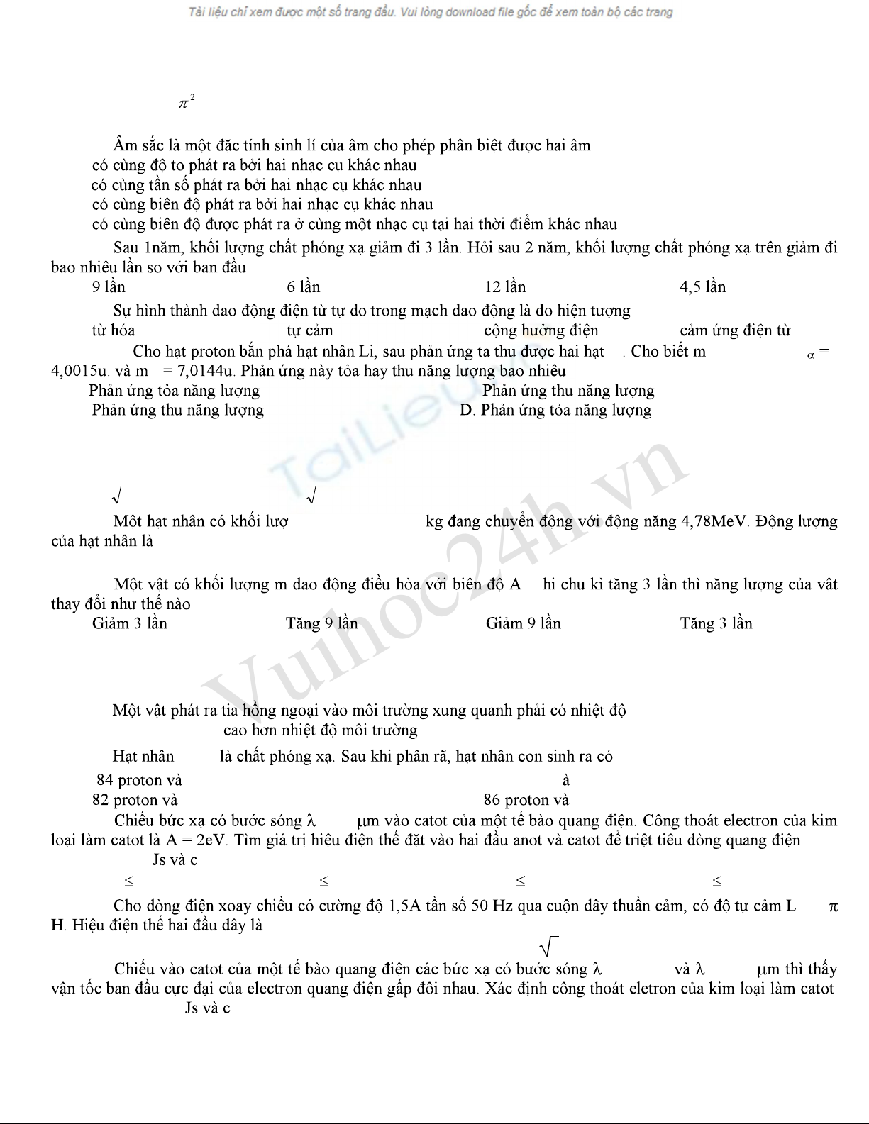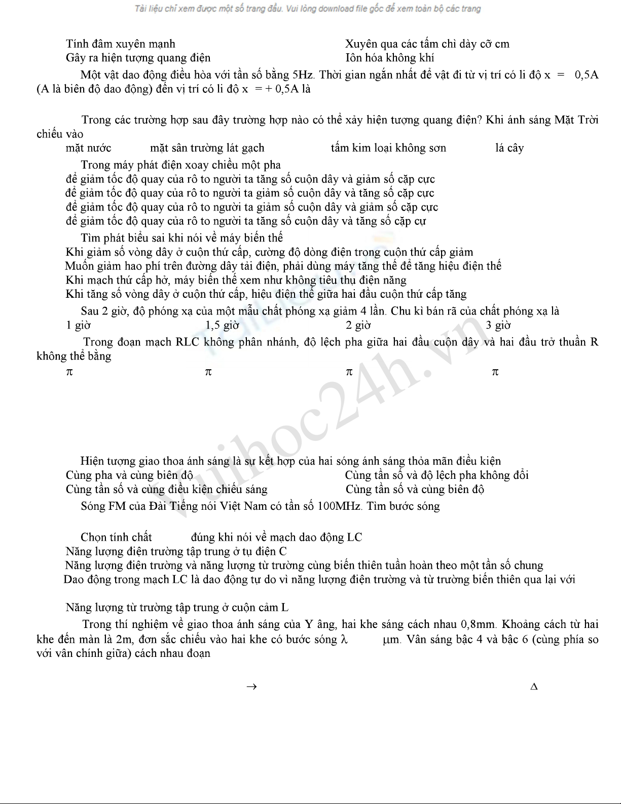 Câu 24: Con lắc lò xo treo thẳng đứng, lò xo có khối lượng không đáng kể. Hòn bi đang ở vị trí cân bằng thì được
