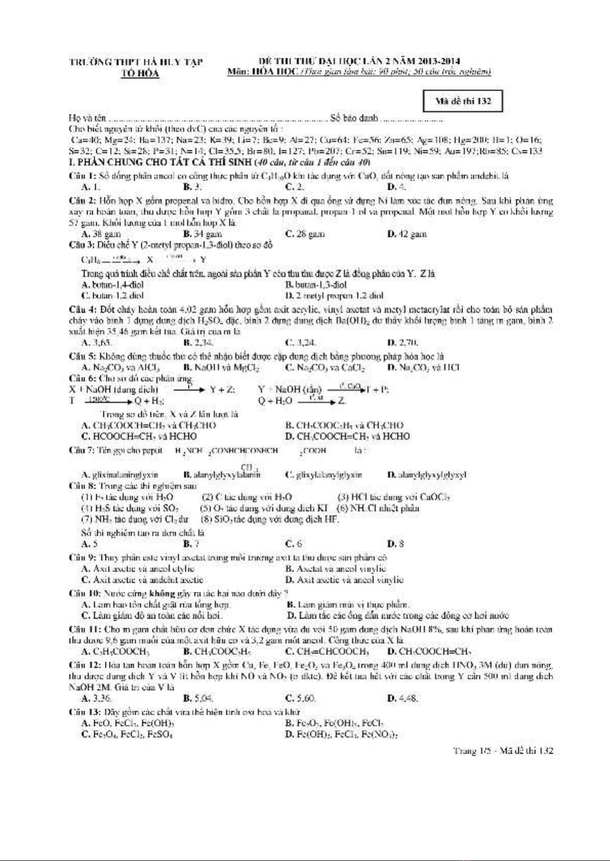 Đề thi thử Đại học lần 2 môn Hóa học năm 2014 (Mã đề 132)