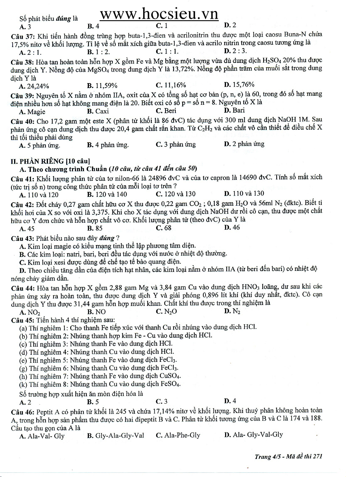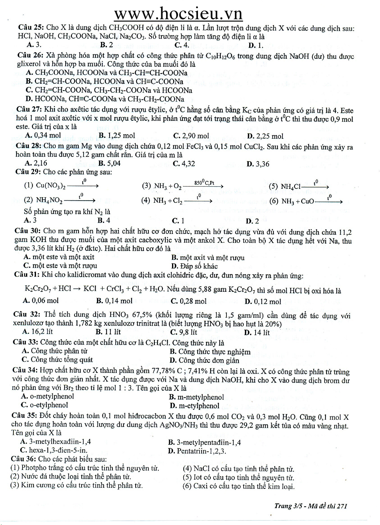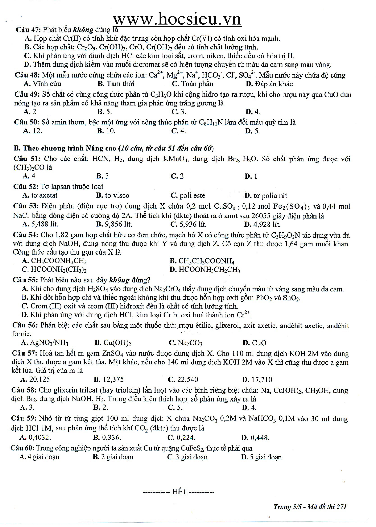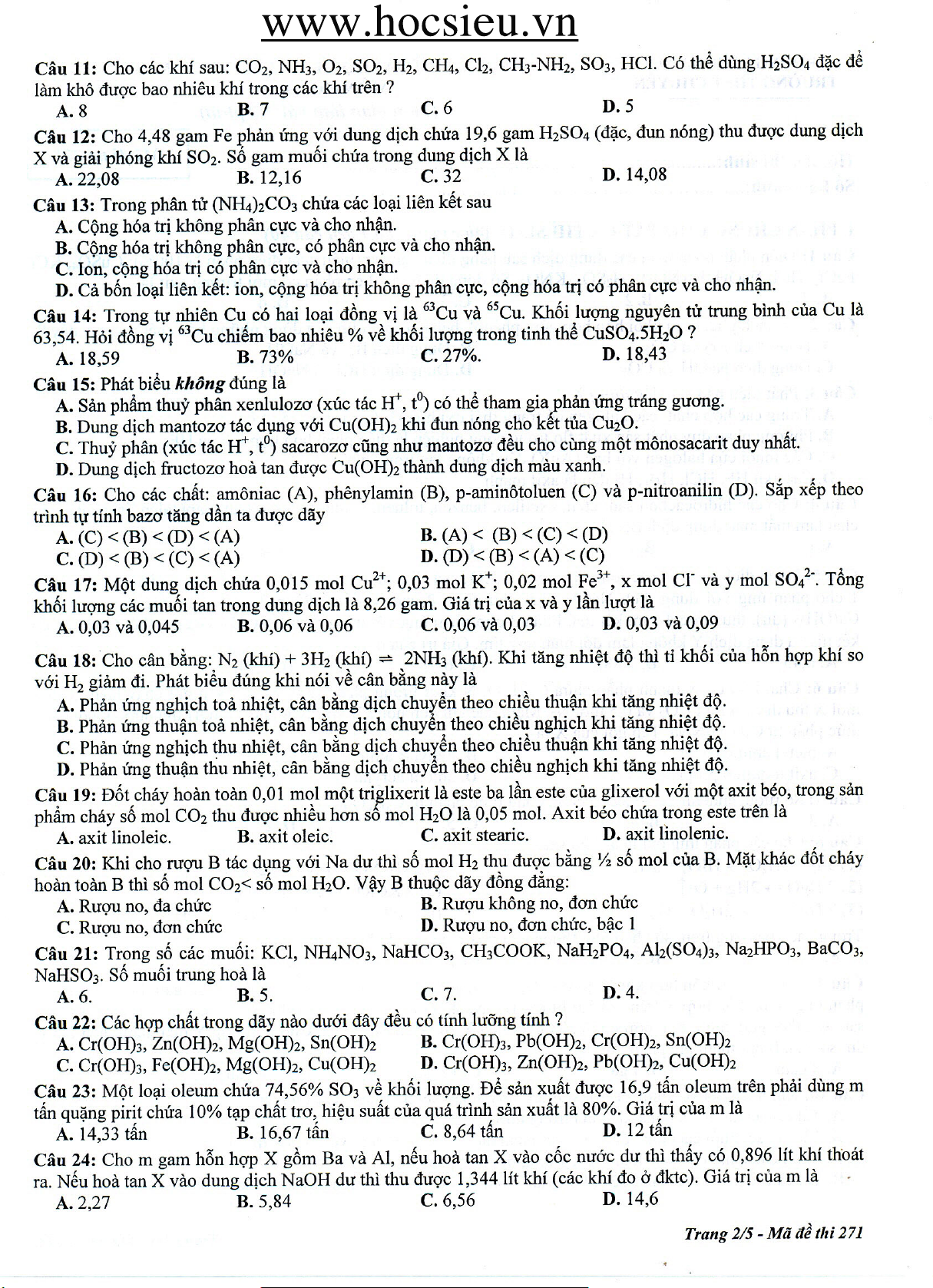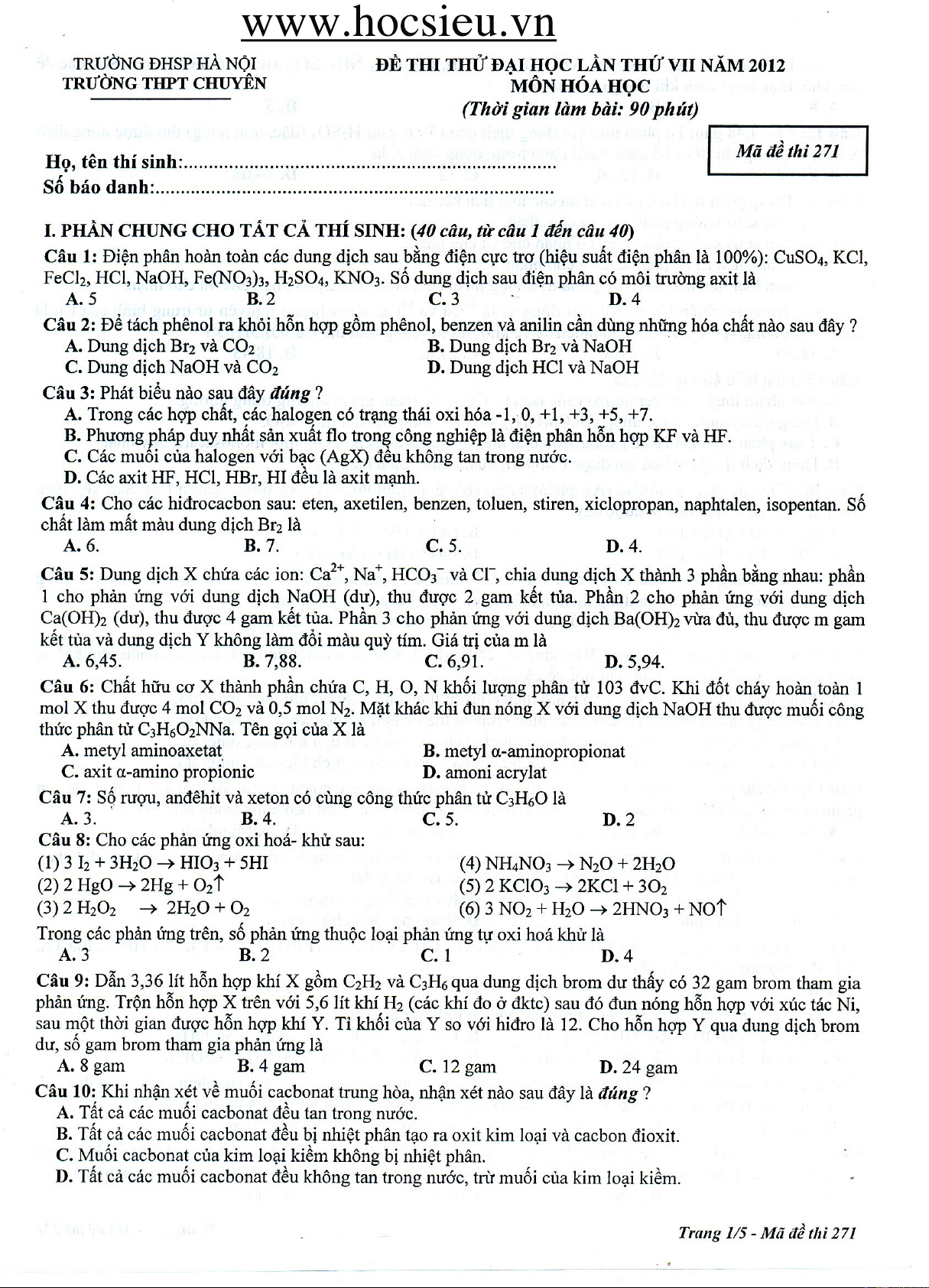 Đề thi thử đại học lần thứ VII Năm 2012 Môn: Hóa Học - Mã đề thi 271